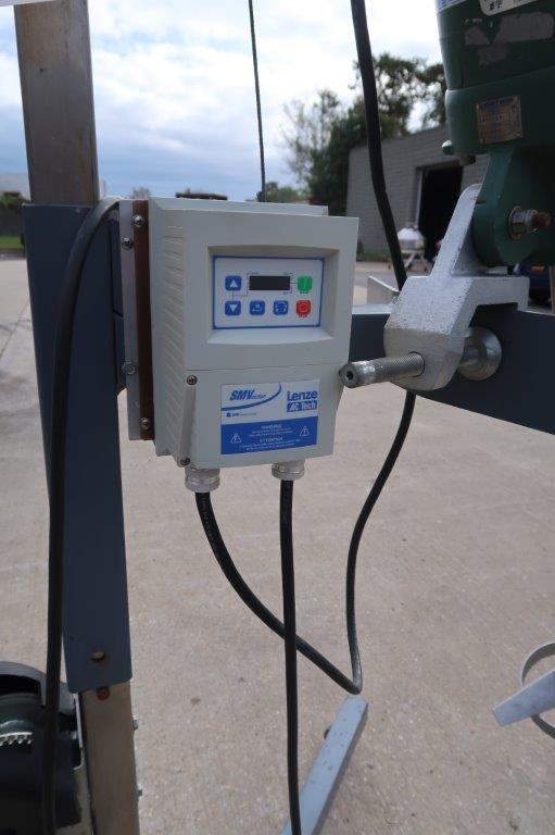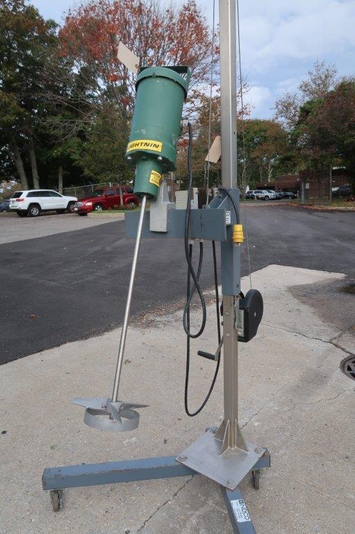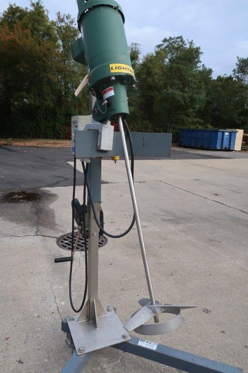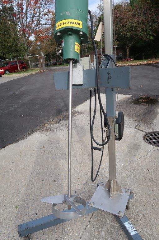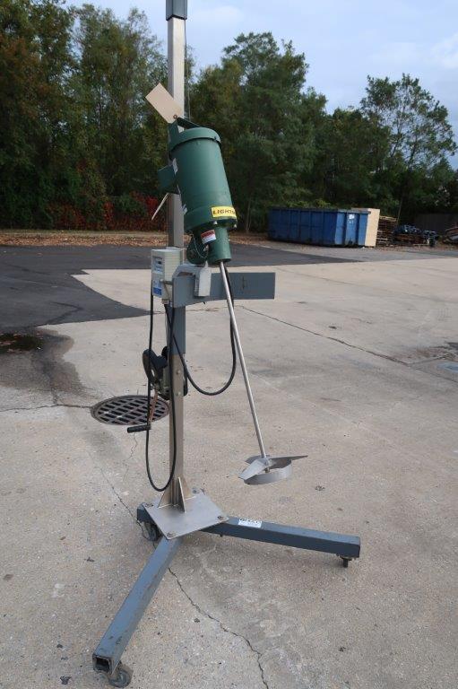 1- Used Lightnin, Model EV1P50, Clamp on Portable Agitator/Mixer, S/N 2448868. Driven by .5HP motor, mixer is on portable stand/hoist on casters and equipped with Lenze AC Tech digital variable frequency drive. Variable Frequency drive box is equipped internally with phase converter, make this mixer run on single phase electrics. With 28 In. long stainless steel shaft and a 10 In. wide pitched blade and stabilizing ring. (Stock # 8570S)