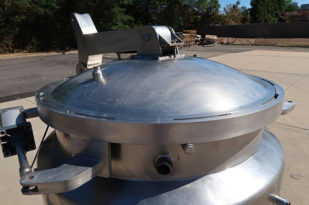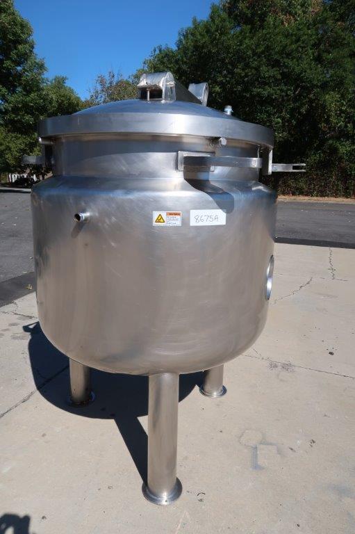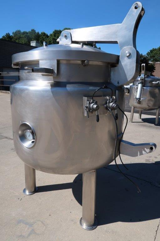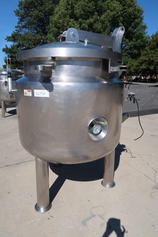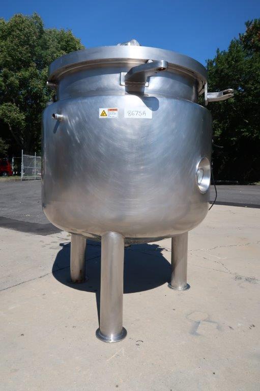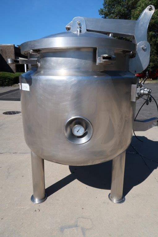 1-Used Approximately 200 Gallon Stainless Steel Jacketed Autoclave, Dimensions approximately 40 In. diameter by 36 In. straight side, plus dished bottom. With top lid, with pneumatic cylinder, vessel has 3 In. Tri-Clamp discharge and 25 In. high stainless steel legs. Last used in the food industry. (Stock # 8675A)