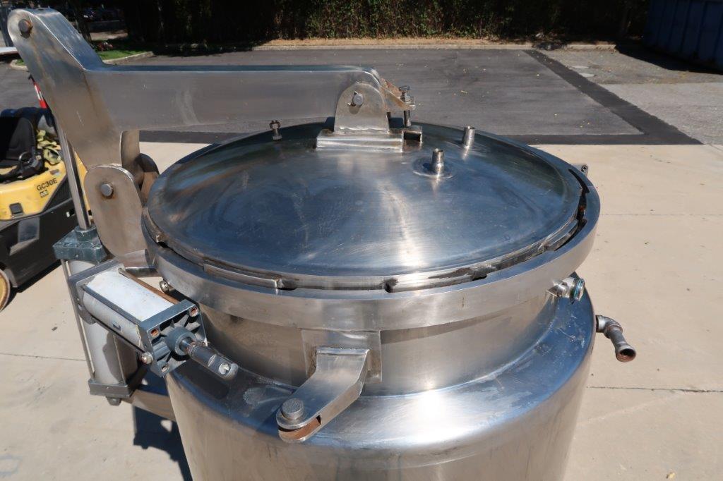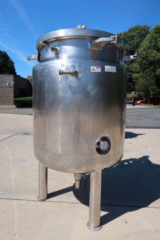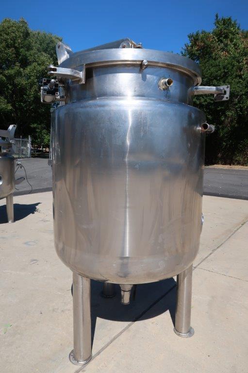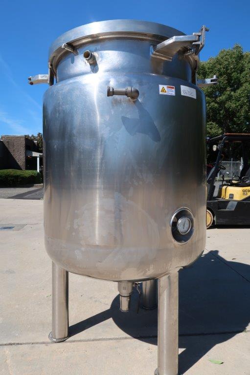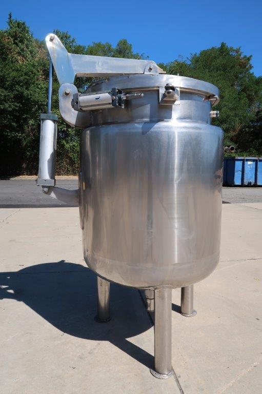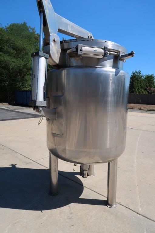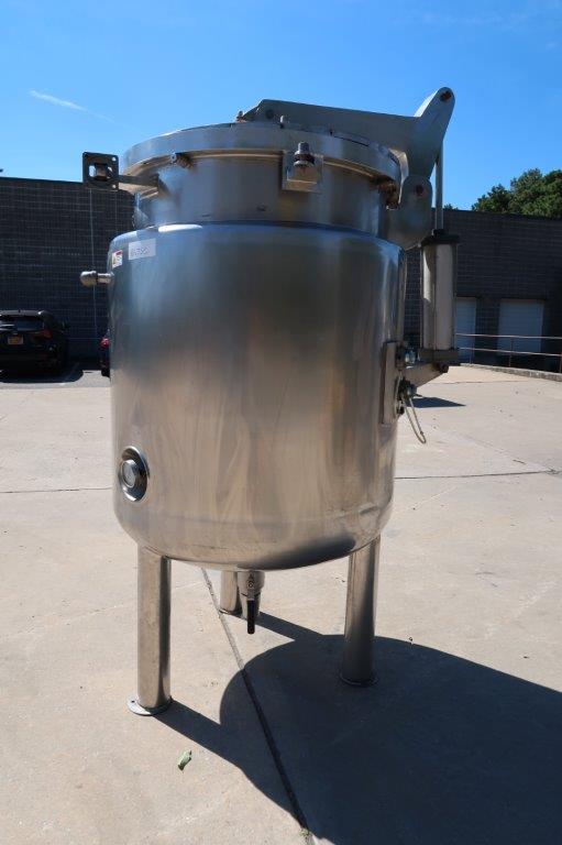 1-Used Approximately 400 Gallon Stainless Steel Jacketed Autoclave. Dimensions approximately 48 In. diameter X 50 In. on straight side, plus dished bottom. Equipped with pneumatic cylinder for lift of top lid, vessel has 3 In. diameter bottom outlet with Tri-Clamp Valve. Last used in food production, vessel has stainless steel legs, approximately 26 In. high. (Stock #8675C)
