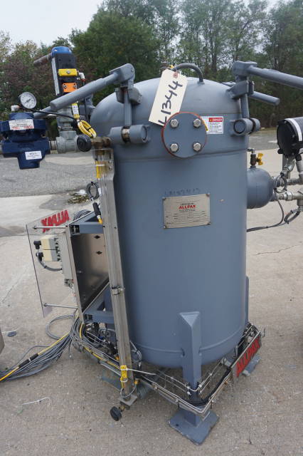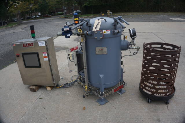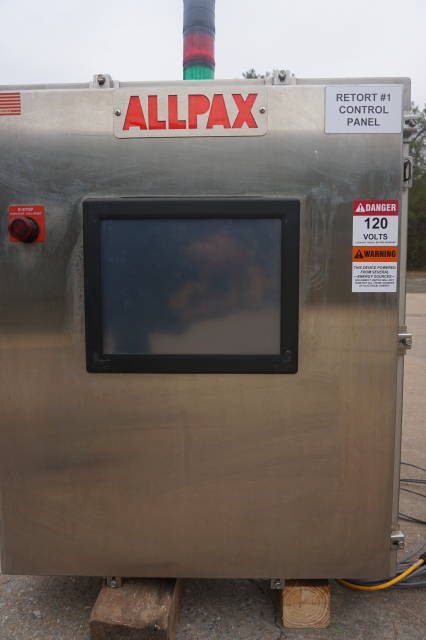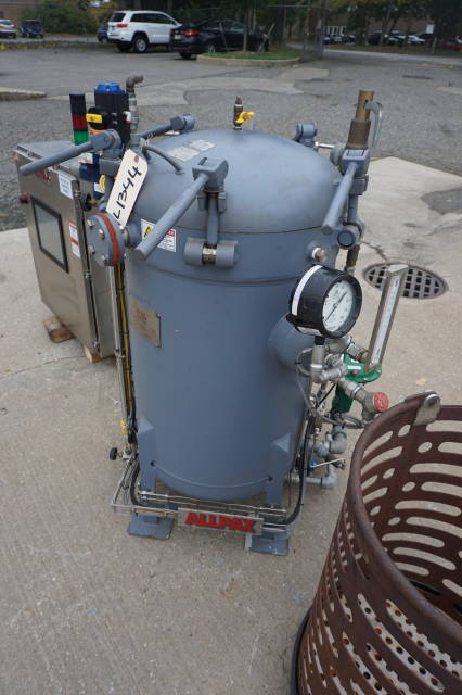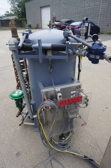 1-Used Allpax Model 2402V Vertical Autoclave/Retort. With manually operated swing open door, basket dims approx. 23 In Diameter X 26 In. deep. Processing modes include steam cook with atmospheric cool and pressurized cool, full water immersion cook with flooded cool and manual mode with PC Controlled manipulation of valves. Vessel rated 40 PSI to full vacuum, ASME coded. With Stainless steel control panels, unit has Allen Bradley control modules. With automatic control suite. (Stock #L1344)