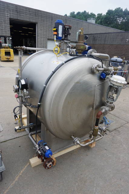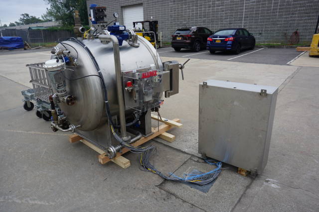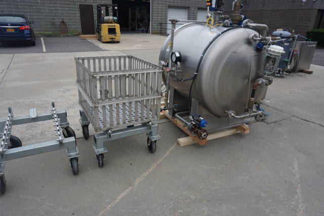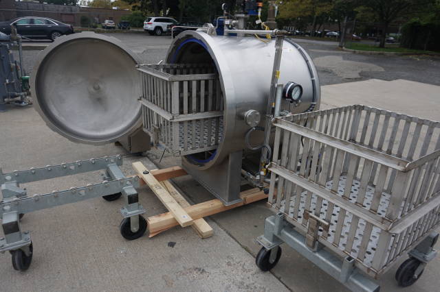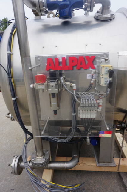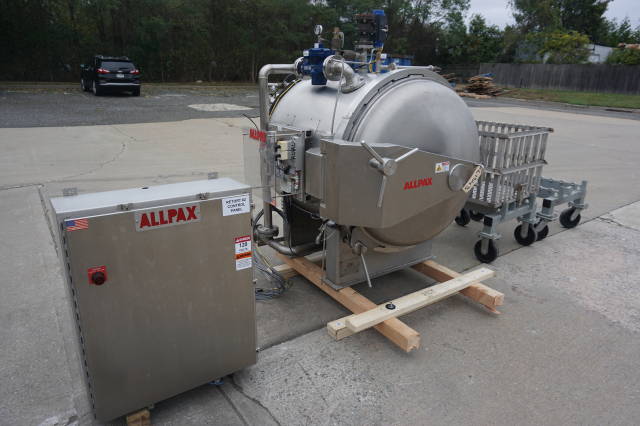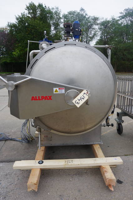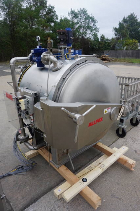 1-Used Allpax Model 3801 Stainless Steel Horizontal Autoclave/Retort, S/N J67-3801. Basket dimensions approx. 26 In. Wide X 33 In. Long X 21 In. High. Processing modes include steam cook with atmospheric cool and pressurized cool, full water immersion cook with flooded cool and manual mode with PC Controlled manipulation of valves. Rated for 58 PSI to full vacuum, ASME coded. Equipped with software monitor. (Stock #L1343)