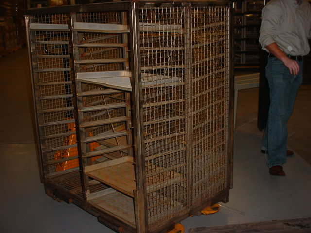 1-Used horizontal steam sterilizer/autoclave, dimensions approximately 72″ diameter by 185″ deep. This two-door sterilizer consists of horizontal shell manufactured by turbo machine co., rated 55 psi/full vacuum at 305 degrees f., national board number 5890, code stamped. With progenesis ii controller with print out, this “air over pressure” sterilizer has “shower cascade” and is equipped with eight (8) stainless steel heavy duty cages each measuring approximately 35″ wide by 44″ long by 57″ high. This complete system is supplied with pump, fillers, and scissor lift for entry and discharge of cages. Sterilizer can hold four (4) cages at a time and was recently refurbished.