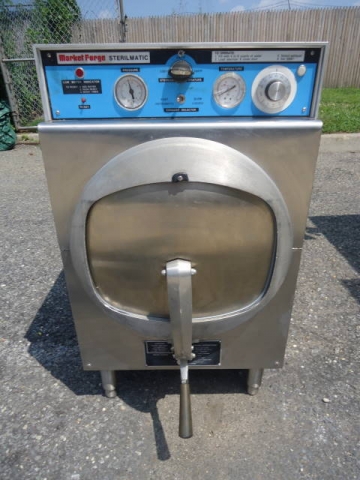 1-USED MARKET FORGE/STERILMATIC TABLETOP AUTOCLAVE MODEL STM-EL, NATIONAL BOARD NUMBER 43427, CODE STAMPED. ELECTRICAL SPECIFICATIONS: SINGLE PHASE, 60 CYCLE, 120-208-240 VOLT. EQUIPPED WITH TIMER, TEMPERATURE AND PRESSURE GAUGES. (STOCK # 7506N)
