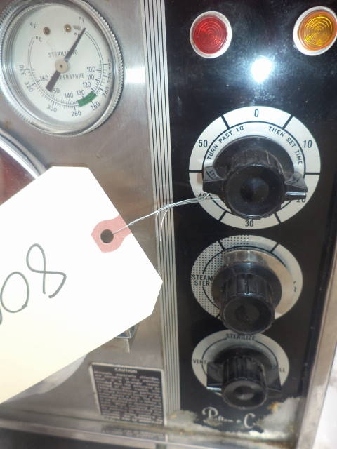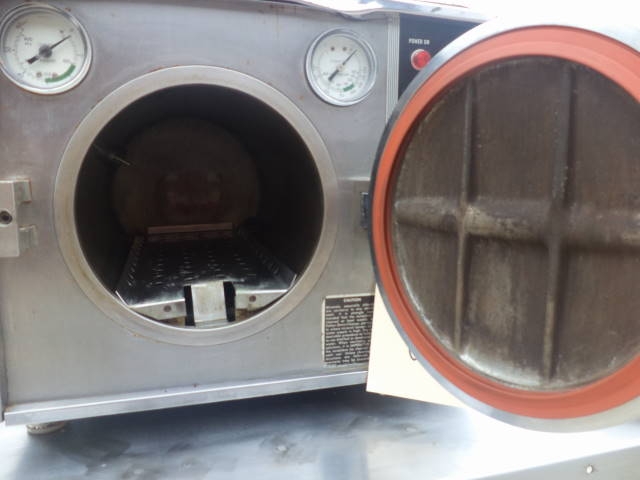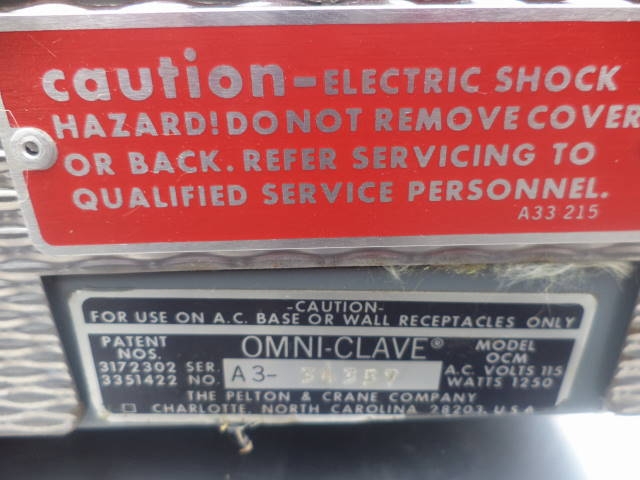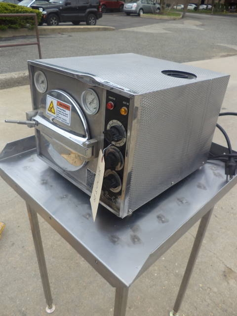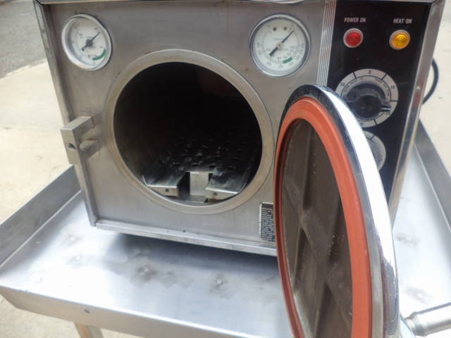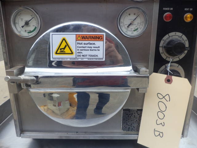 1- Used Omni-Clave Model OCM tabletop Sterilizer, S/N A3-34357. Interior chamber measures approx. 7 in. diameter x 14 in. long. With single phase 115 Volt electrics, sterilizer has temperature control and gauges and quick opening front. Stainless steel table shown in photos not included. (Stock #8003B)