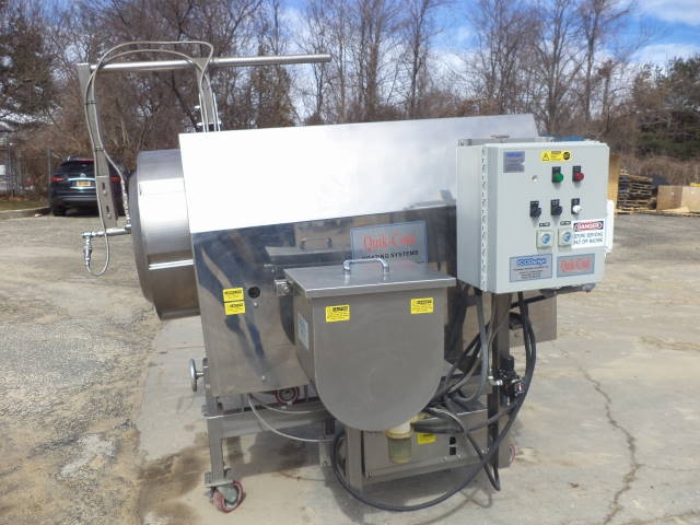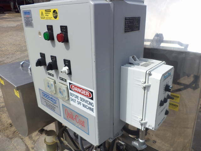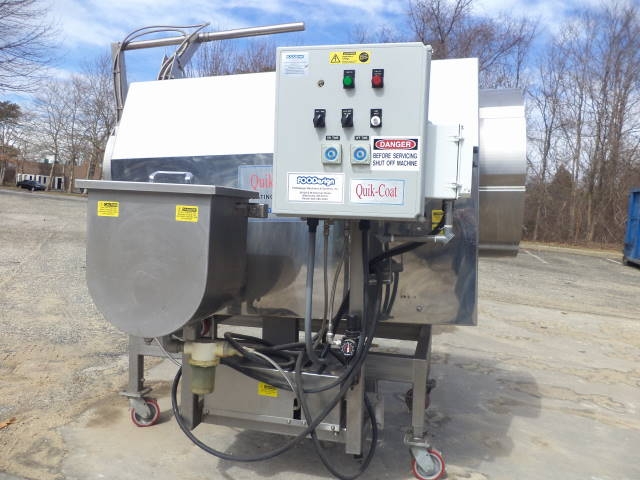 1-Used Foodesign “Quik-Coat” Model QSS-3AN-175 stainless steel coating drum/seasoner, Serial Number 2045-02-50. Equipped with approximately 28 inch diameter by 74 inch long rotating drum, unit is on stainless steel framework with casters for portability. With internal spray heads, unit has 12 inch by 18 inch liquid holding tank and control panel with variable speed controls. Utilizes single phase electrics. (Stock #7879C)
