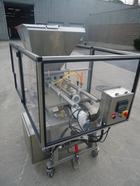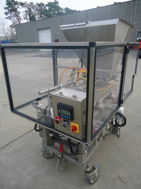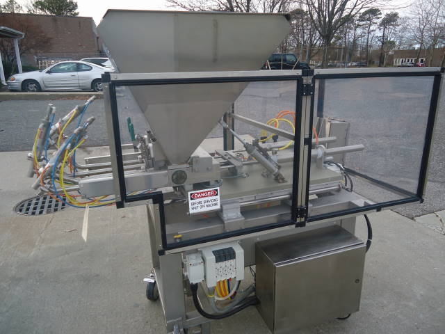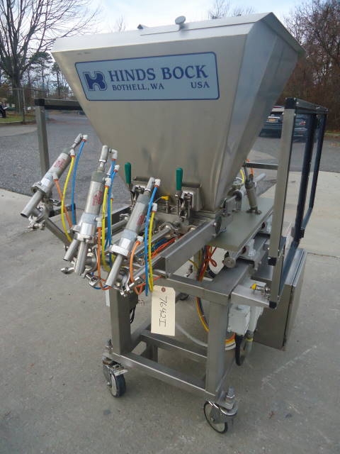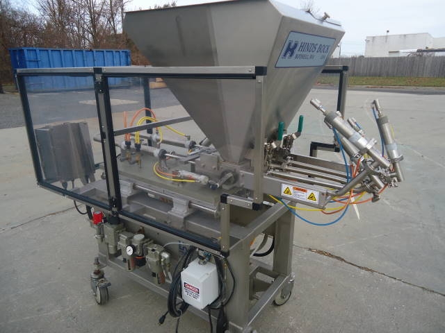 1 – USED HINDS BOCK MODEL 4P-04 FOUR HEAD FILLER/DEPOSITOR, SERIAL# 5665. ON CASTERS FOR PORTABILITY, FILLER IS PNEUMATICALLY DRIVEN AND HAS ALLEN BRADLEY PANELVIEW 300 CONTROLLER. WITH APPROX. 1-1/2 IN. DIAMETER PISTONS, MACHINE HAS TOP FEED HOPPER AND ALL STAINLESS STEEL CONTACT PARTS. WITH MSBO SPOUTS FOR FILLING OF HARD TO HANDLE PRODUCTS LIKE PIE FILLING, TURNOVERS, ETC. THIS FILLER IS IDEAL FOR TRAY LINES, HORIZONTAL VACUUM FORMERS, ETC. CAN BE SUPPLIED WITH CONVEYOR, AT ADDITIONAL COST. (STOCK# 7642i)