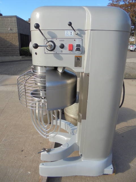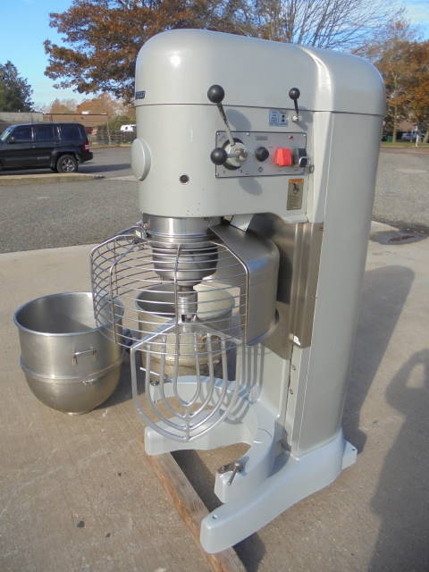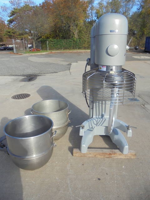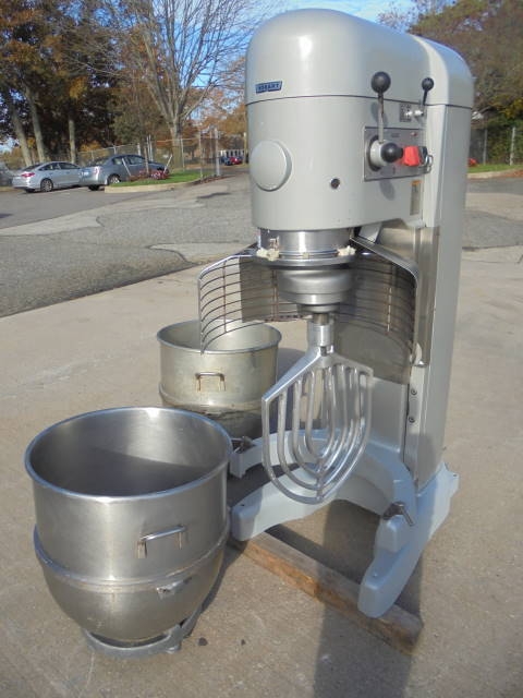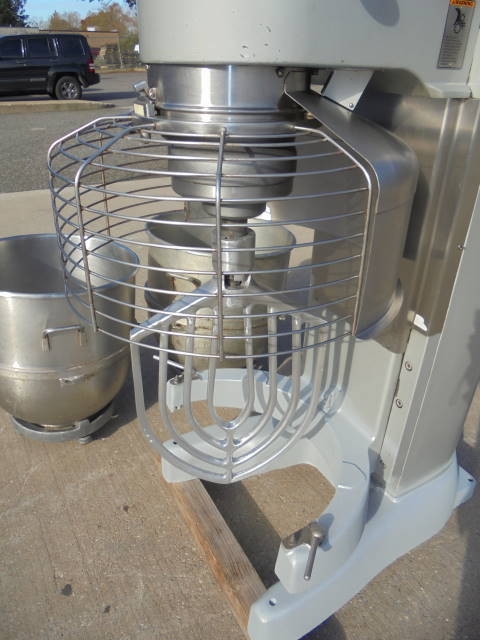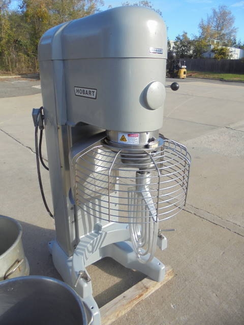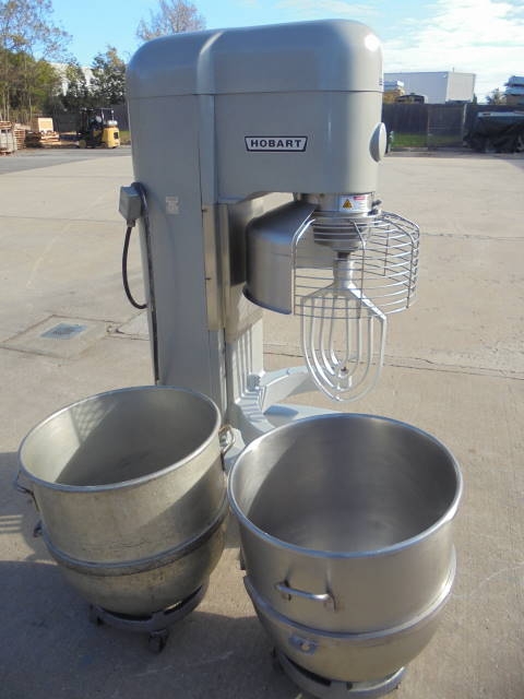 1-Used Hobart Model V1401 140 Qt. Bowl Mixer, S/N 11-1033-938. This 4-speed Mixer comes equipped with two (2) 23 in. diameter Stainless Steel Bowls, each with dolly. With Automatic Bowl Lift feature, Mixer has safety cage and flat beater mixing attachment. Driven by 5 HP 3/60/200 volt motor. Mixer last used in the chocolate fudge industry. (Stock #8157)