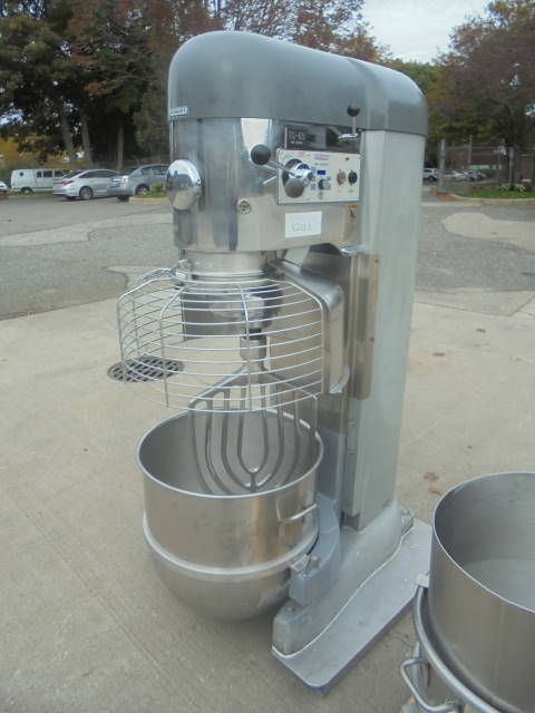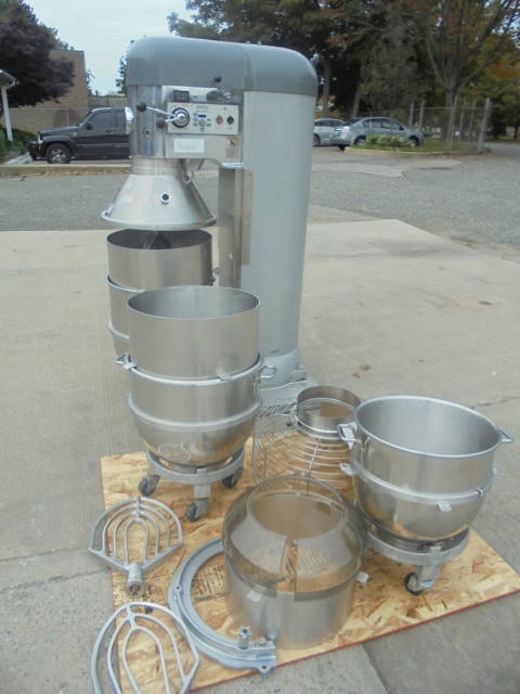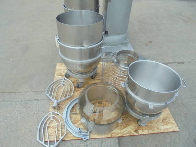 1-Pre-Owned Hobart V1401 140 QT. Bowl Mixer, S/N 31-1082-141. Last used in pharmaceutical production, this four speed Mixer is driven by 5 HP 3/60/230-460 volt motor. With digital read out timer control, in addition to the 140 qt. bowl and flat beater mixing attachment , mixer also comes equipped with two (2) smaller bowls and two (2) smaller beater attachments, as well as stainless steel hood , safety guards and dollies. (Stock #8231A)
