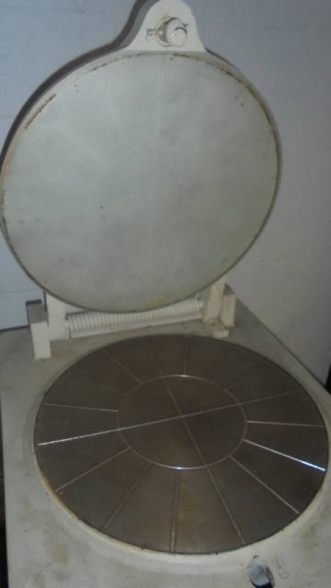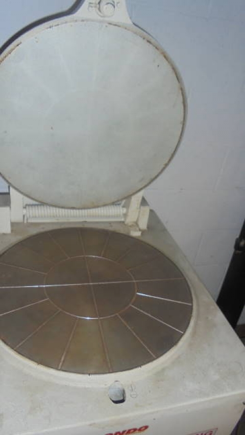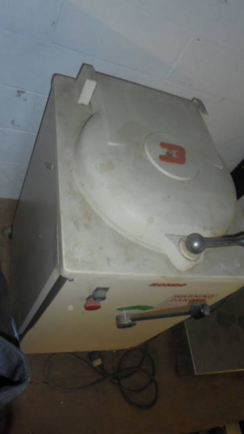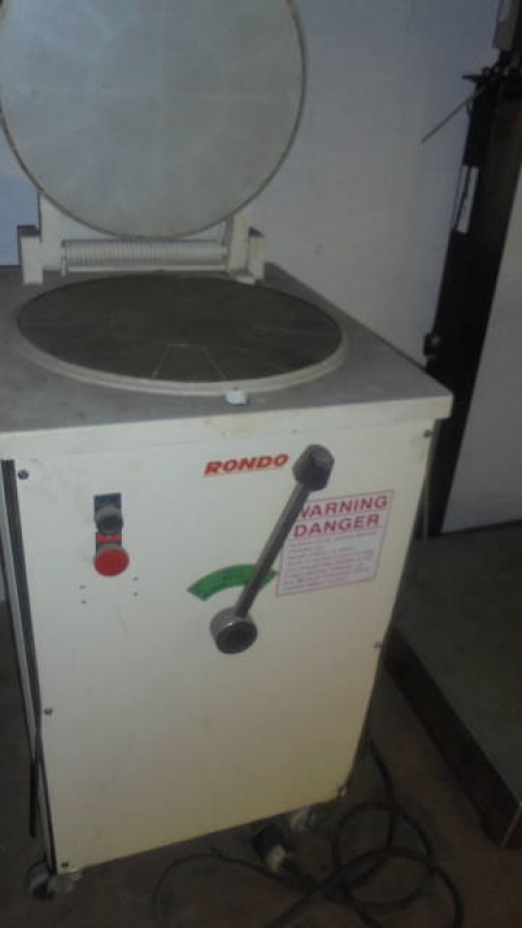 1-USED RONDO DOUGH DIVIDER, SERIAL #070488. PORTABLE CABINET ON CASTERS MEASURES APPROX. 21″ X 24″ X 32″ HIGH, DIVIDER TOP IS 18″ DIAMETER. WITH HINGED LID, HAS FRONT CONTROL LEVER. Electrics 3/60/190-230 volts. (STOCK #5328i)