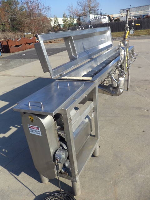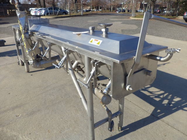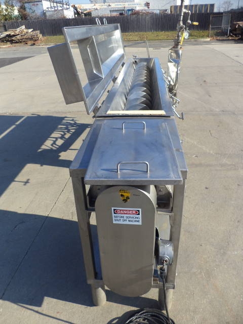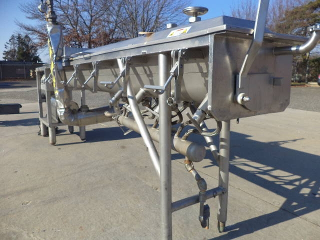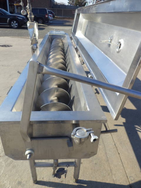 1-Used Damrow Brothers Stainless Steel Horizontal Screw Cooker, S/N 0479064-501. Equipped with approx. 12 in. diameter X 120 in. long screw, Cooker features steam injection and has approx. 4 in. X 7in. end discharge. Mounted on stainless steel stand, there is a hinged lid and cooker was last used on various cheese products at a dairy facility. Driven by 5 HP electric motor, Cooker can be used for a variety of other food products including pizza crumbles, meat, shrimp, rice, pasta, fruit, vegetables and an assortment of portioned meats. (Stock #7951D)