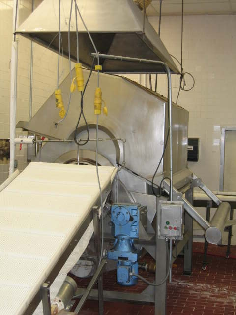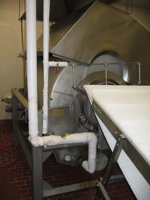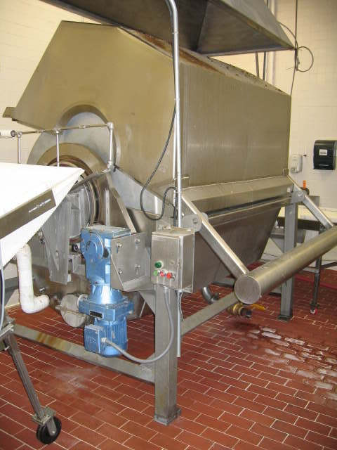 1-Used lyco 48″ diameter x 6′ face rotary s/s drum blancher, model b-12-87 a5111-6. Driven by eurodrive variable speed motor and reducer, machine has stainless steel pushbutton starter and stainless steel perforated drum. Last used for cooking pasta.