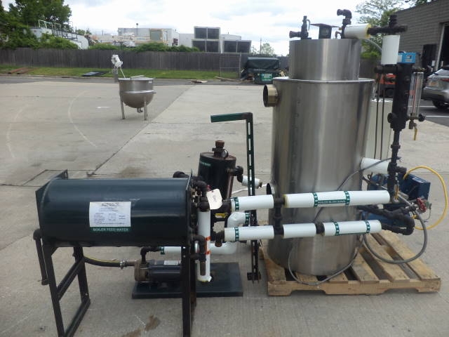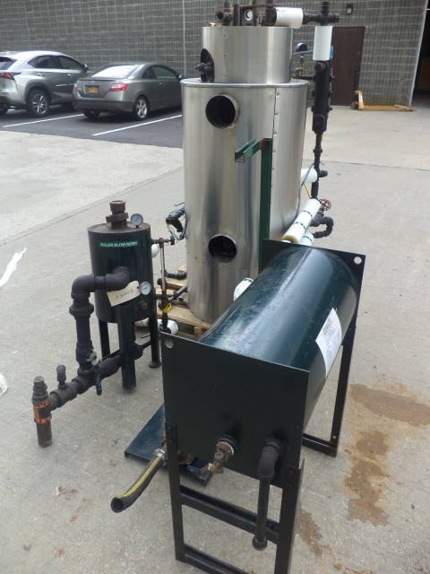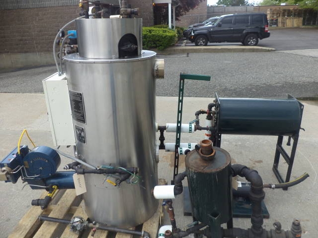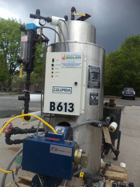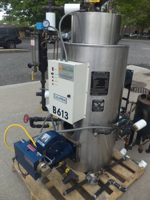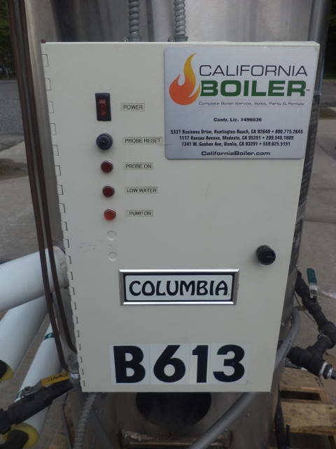 1-Used Columbia Type CT Gas Fired Boiler, S/N 155270. Rating HP 6, Maximum working pressure 150 PSI, National Board #145250. Rated steam capacity 207 lbs./hour, boiler has stainless steel shrouding, and single phase, 60 cycle, 115 volt electrics. With self-contained gas burner, boiler has front mounted control panel, Columbia return tank with pump, and Boiler “Blow Down” tank. (Stock # 8005V)