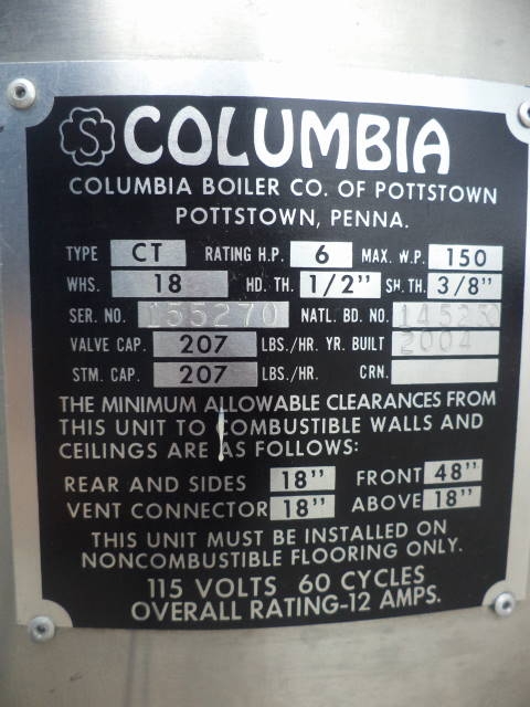 Columbia CT Gas Fired Boiler , Rating HP 6, 150 PSI WP, Single Phase Electrics