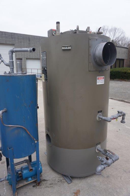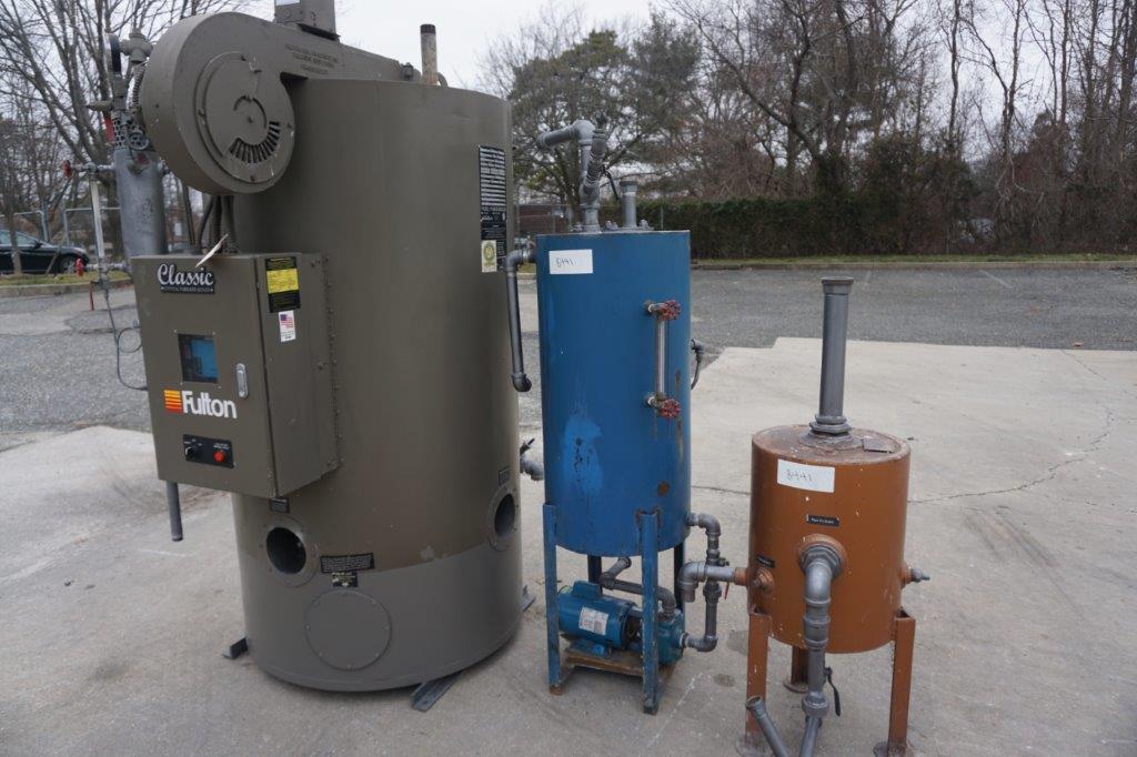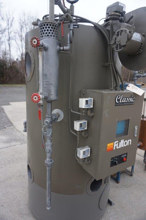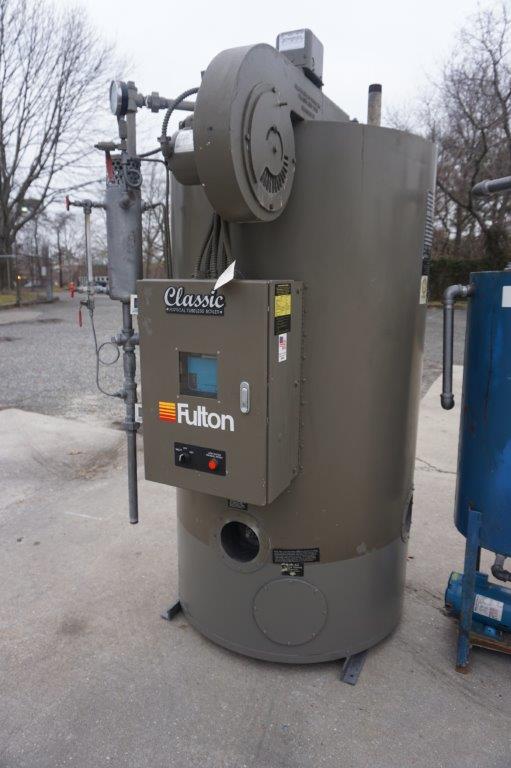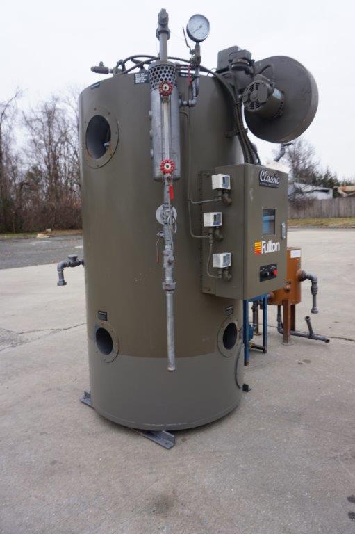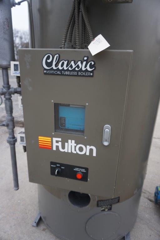 1-Used Fulton “Classic” Vertical Tubeless Boiler, Model FB-020-A. This natural gas boiler has National Board # 114757, Code Stamped. Equipped with condensate return tank and blowdown separator tank, Boiler has single phase electrics. (Stock #8441)