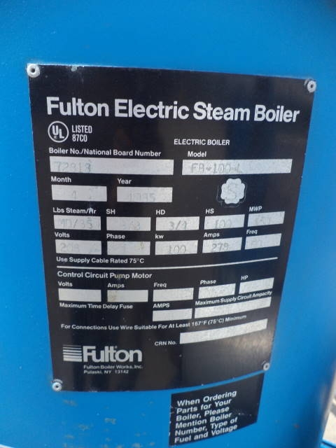 1-Used Fulton Electric Steam Boiler Model FB-100-L, National Board #72818. This skid mounted System has multiple features including expansion tank, blowdown tank and circulation pump. Rated MD/350 lbs. steam/hour, electrical specifications: 3/60/208 volt. Last used for heating/generating steam in jackets of various Processing Kettles in personal care products manufacturing facility. (Stock #7856B)