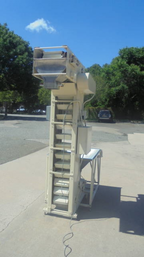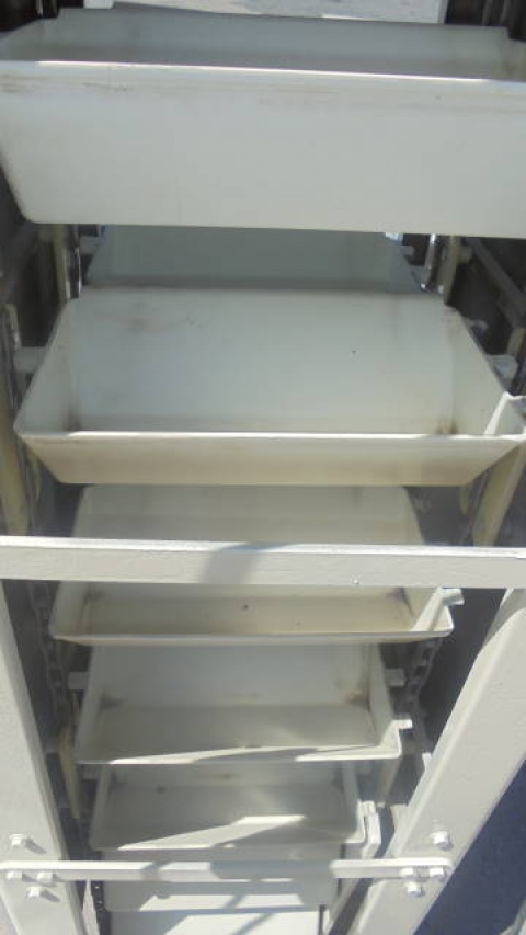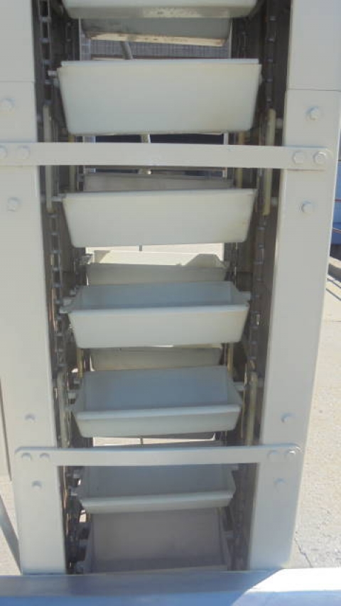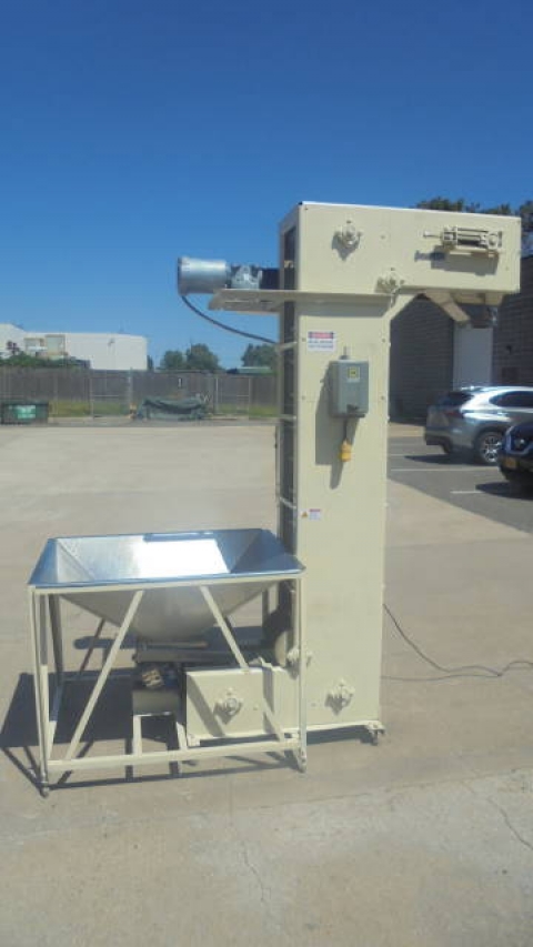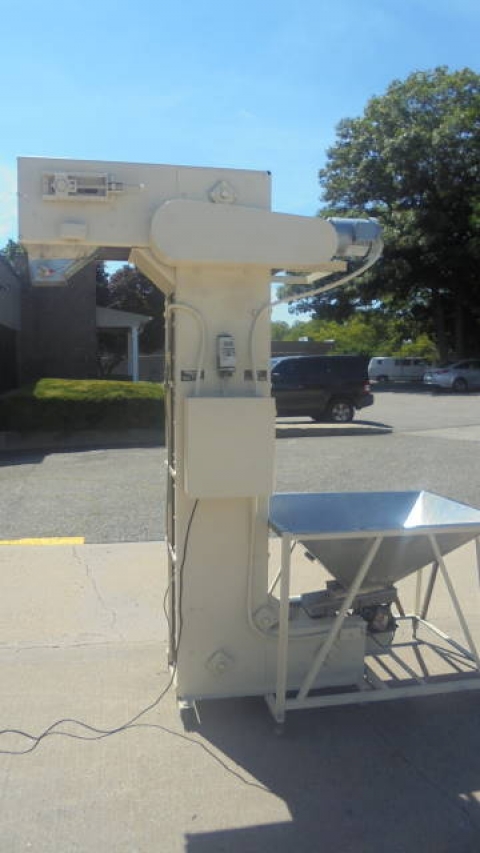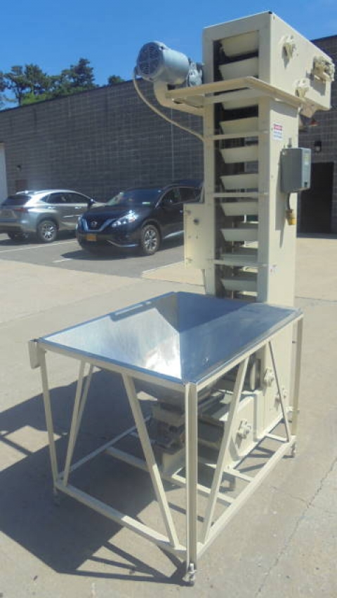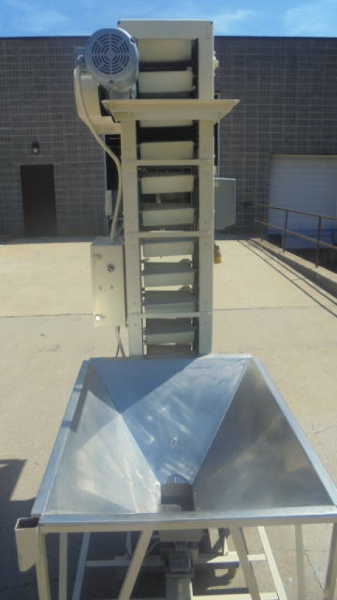 1-Used Frazier & Son “Whiz Lifter” Bucket Elevator, S/N 75-3053. Last used in snack food industry, elevator has 6 In. wide X 10 In. long buckets. With 35 In. X 45 In. stainless steel floor level product hopper. With Eriez vibrator, elevator currently has 78 In. discharge height. (Stock #8202M)