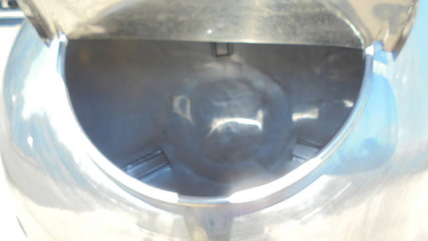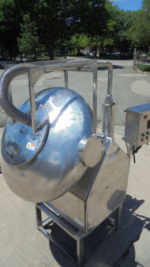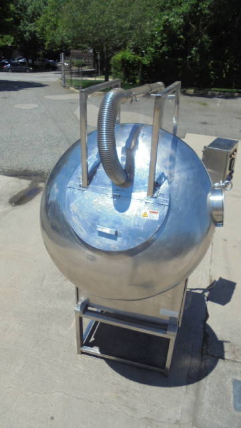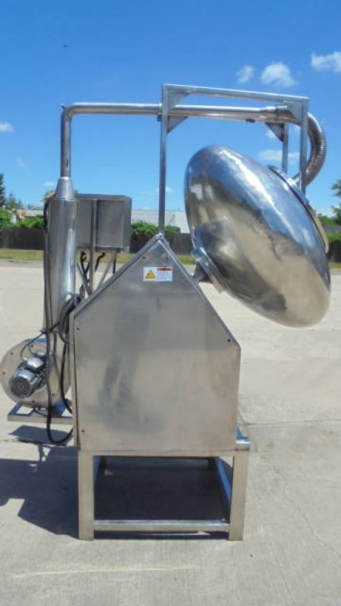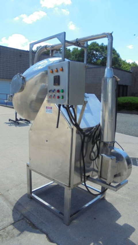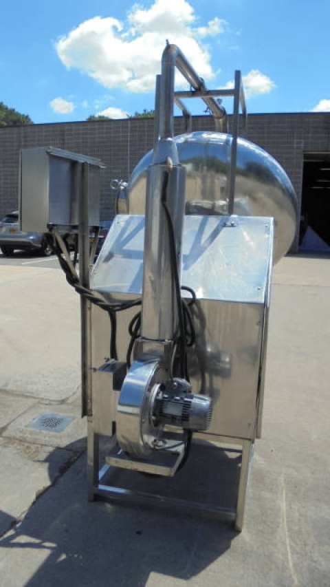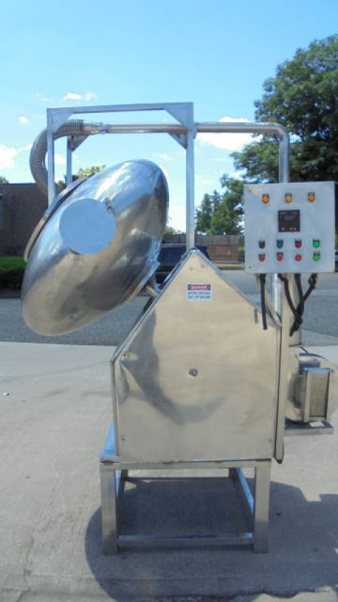 1-Used 48 In. Diameter All Stainless Steel Coating Pan. Pan has internal baffles and cover and is mounted on stainless steel base. With self-contained blower assembly, unit has stainless steel starter box. Last used in the snack food industry. (Stock #8202A)