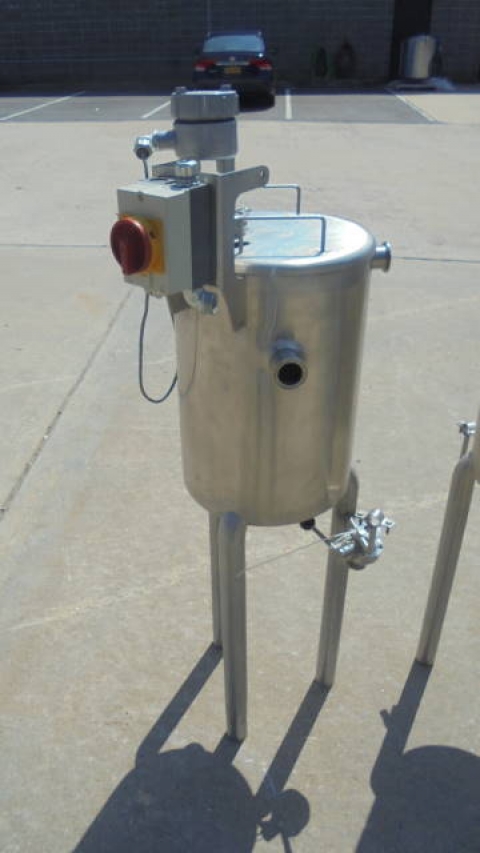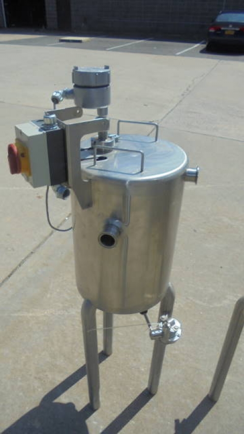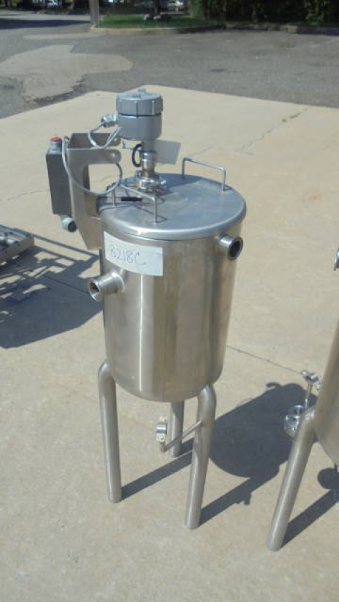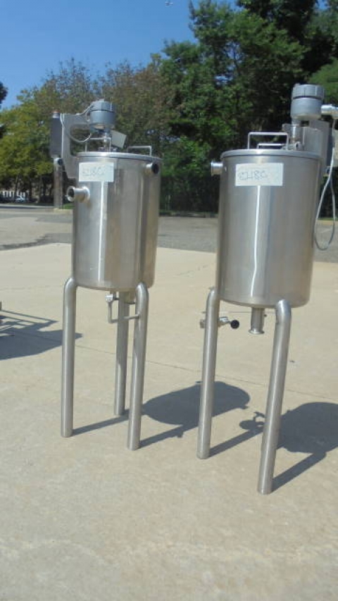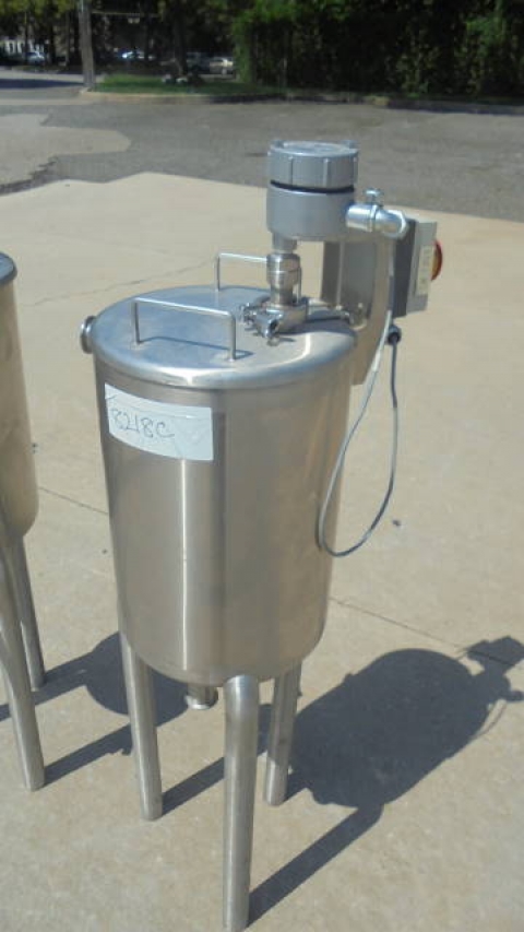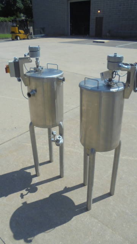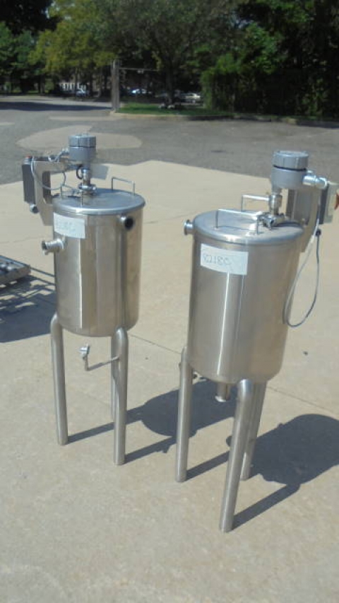 2- Used Lab Stainless Steel Jacketed Vertical Chocolate Melters. Each unit has interior dimensions of approx. 8 in. diameter X 17 in. deep. Overall dimensions approx., 12 in. diameter X 18 in. deep. On stainless steel legs, units have stainless steel hinged lids, as well as Arklay Level Switch. Equipped with bottom discharge outlet with Tri-clamp fittings. (Stock #8218C)