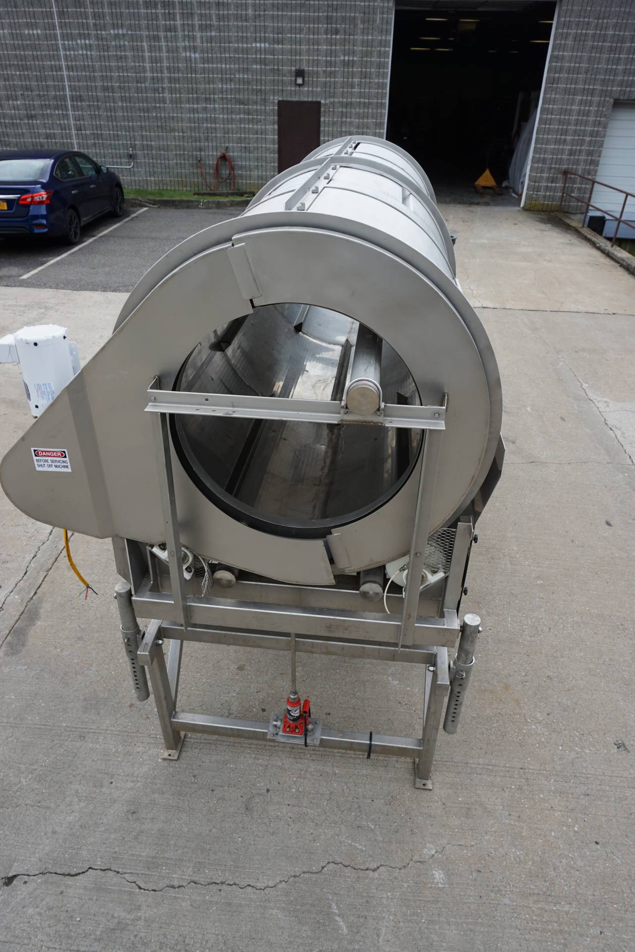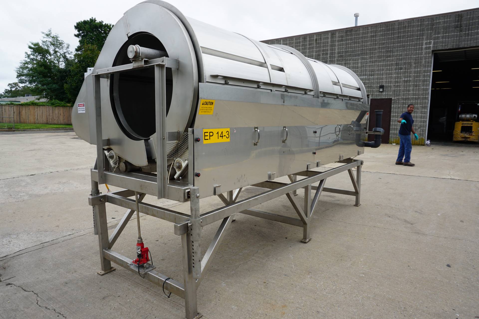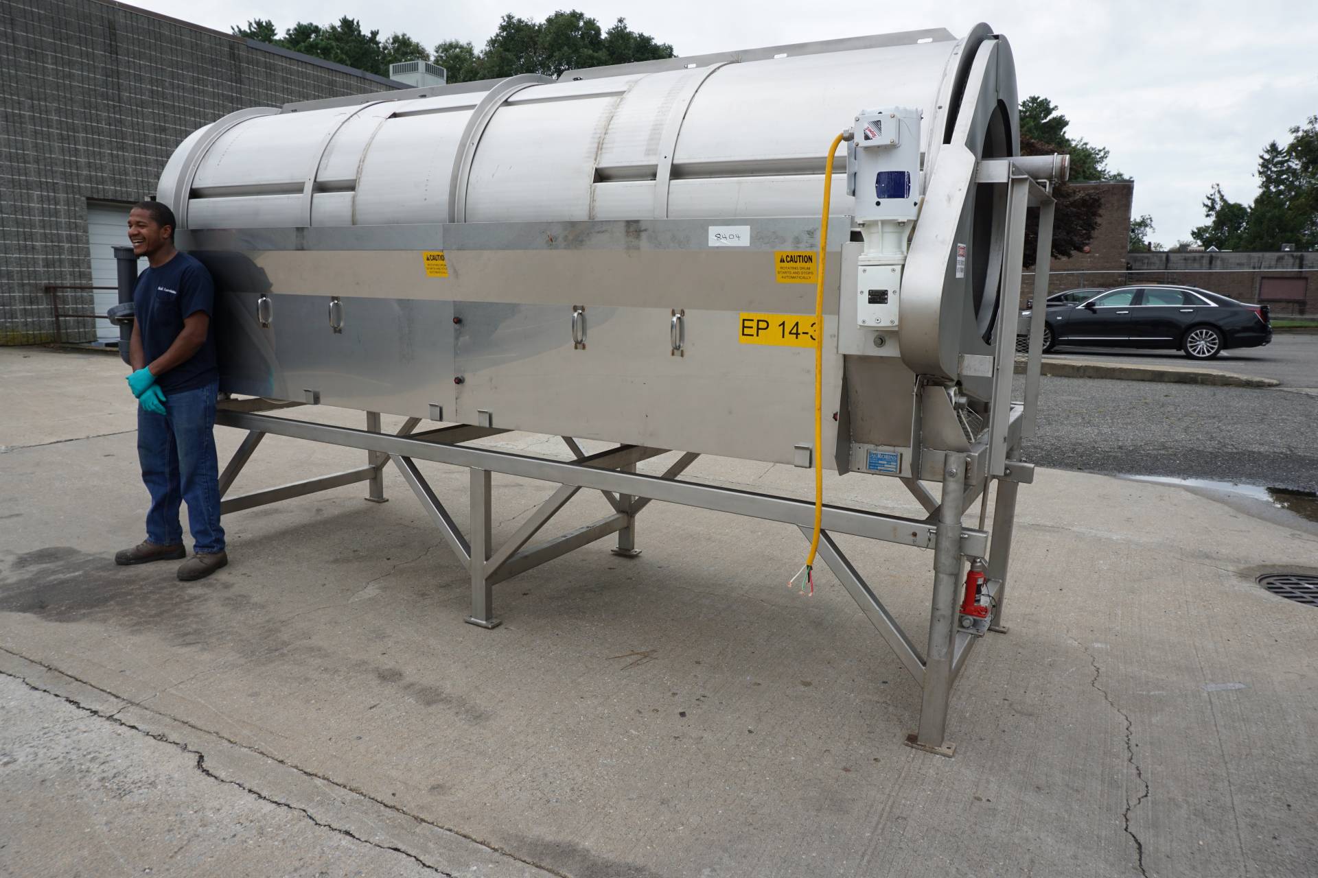1-Used A K Robins approx. 4 Ft. Wide X 13 Ft. Long Stainless Steel Rotating Drum Cooler/Seasoning Drum, S/N 93038. Last used in the food industry, machine has tilt mechanism and is driven by 1.5 HP 3/60/203-230-460 volt gear motor. On stainless steel base, this unit has internal spray bar and internal carriers/baffles to handle product. (Stock # 8404)