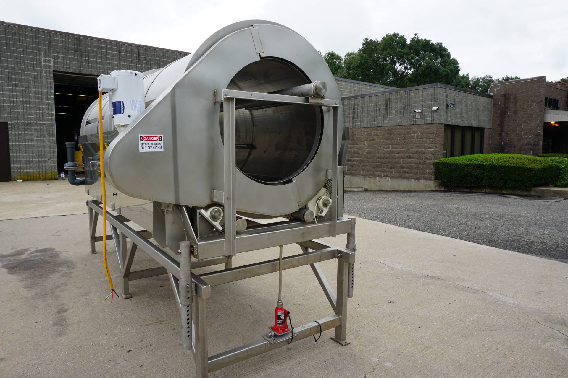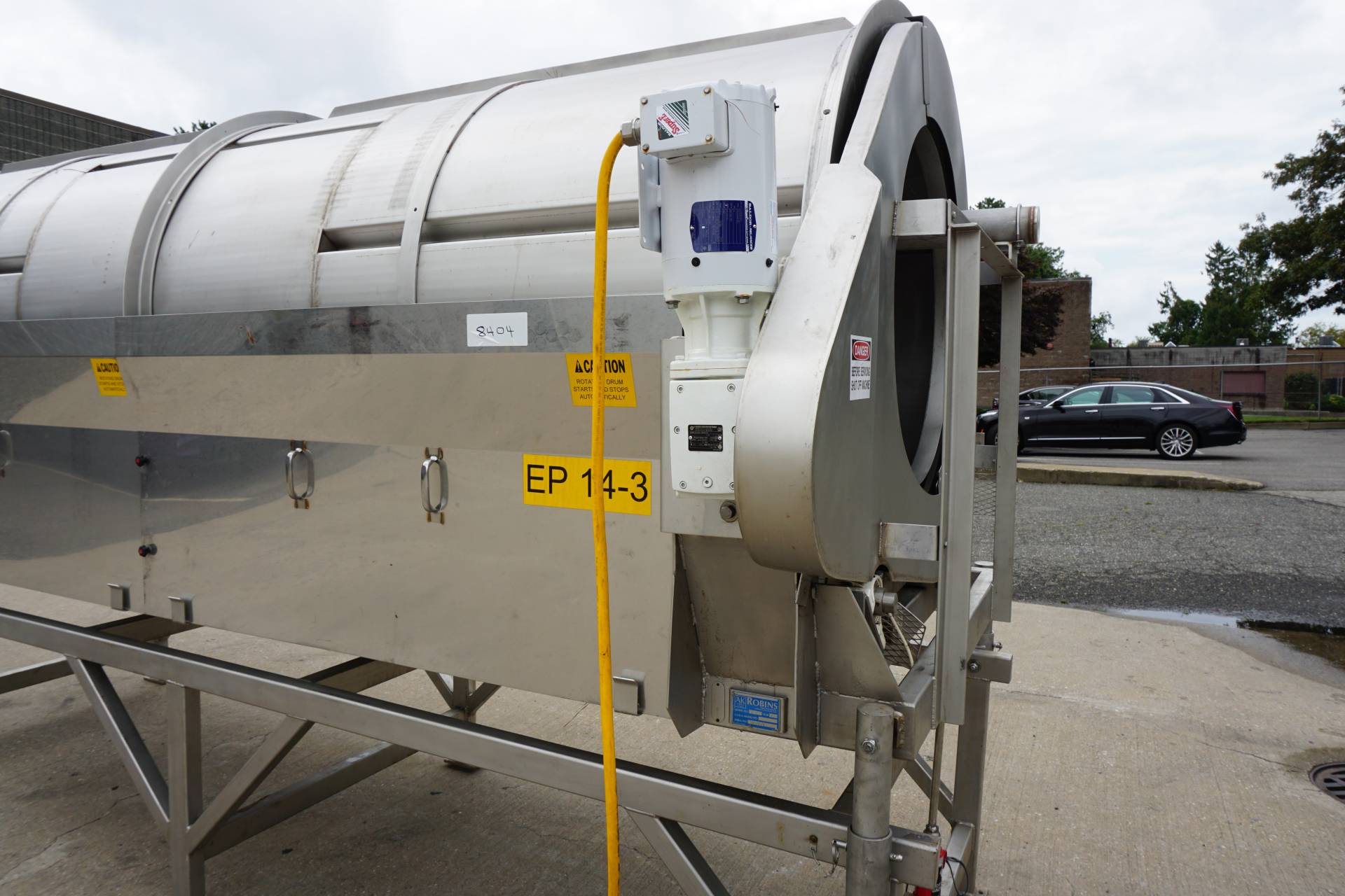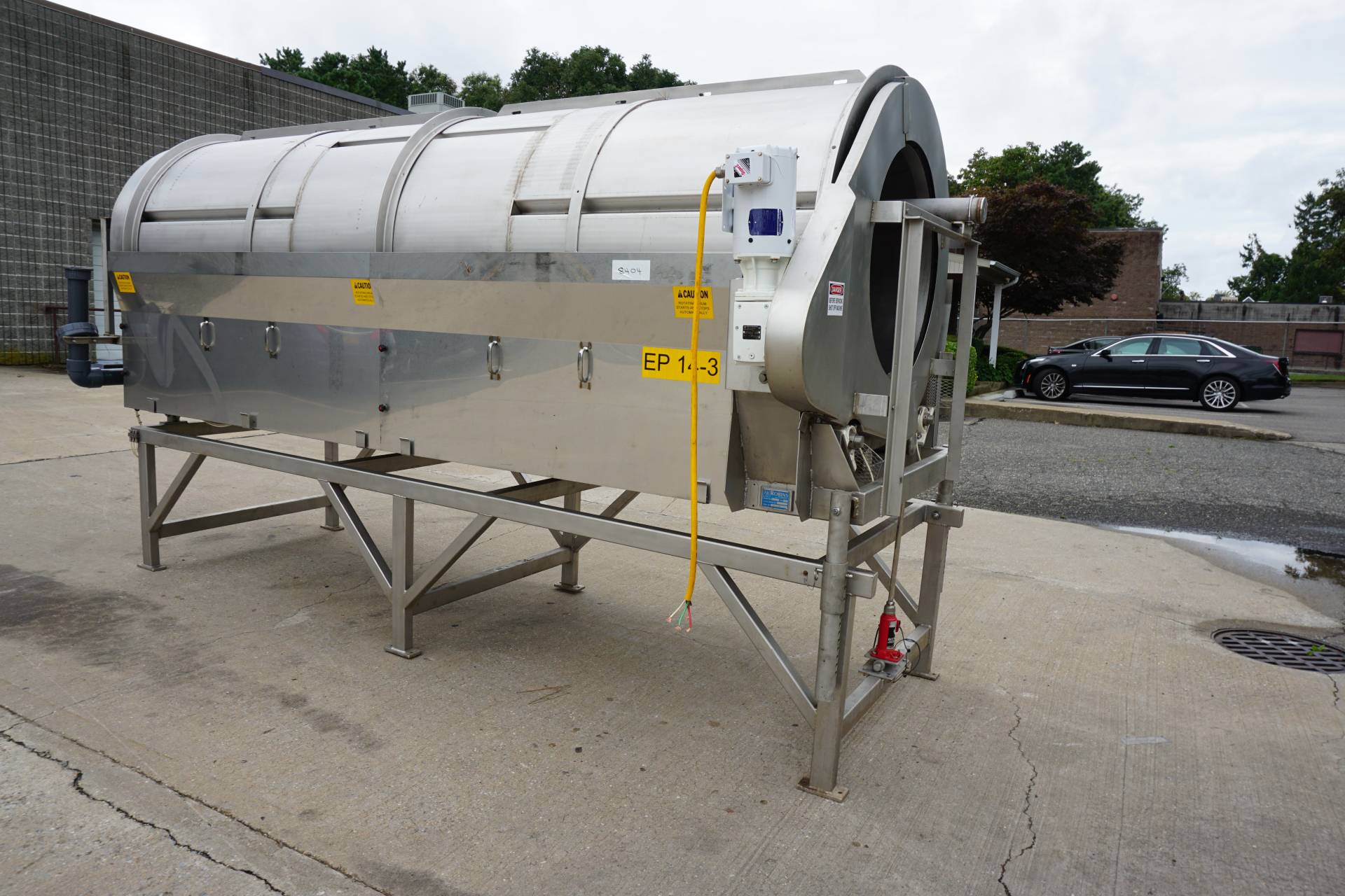 1-Used A K Robins approx. 4 Ft. Wide X 13 Ft. Long Stainless Steel Rotating Drum Cooler/Seasoning Drum, S/N 93038. Last used in the food industry, machine has tilt mechanism and is driven by 1.5 HP 3/60/203-230-460 volt gear motor. On stainless steel base, this unit has internal spray bar and internal carriers/baffles to handle product. (Stock # 8404)