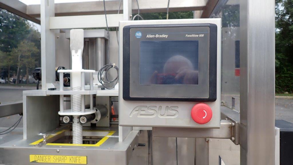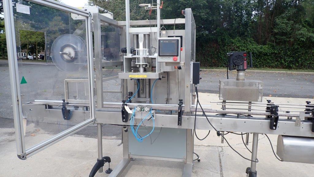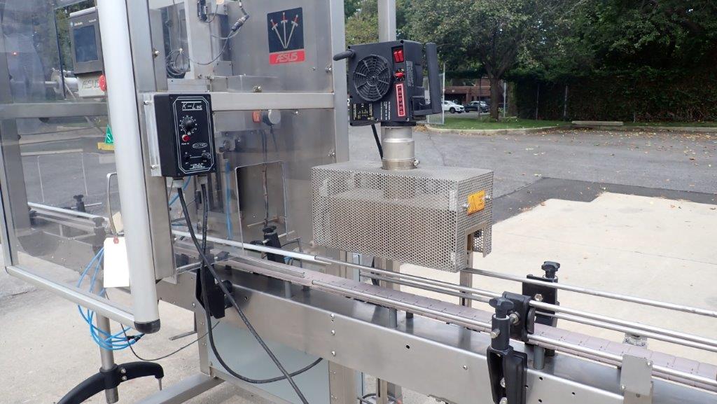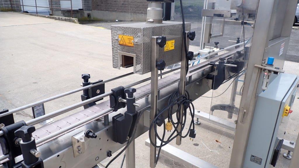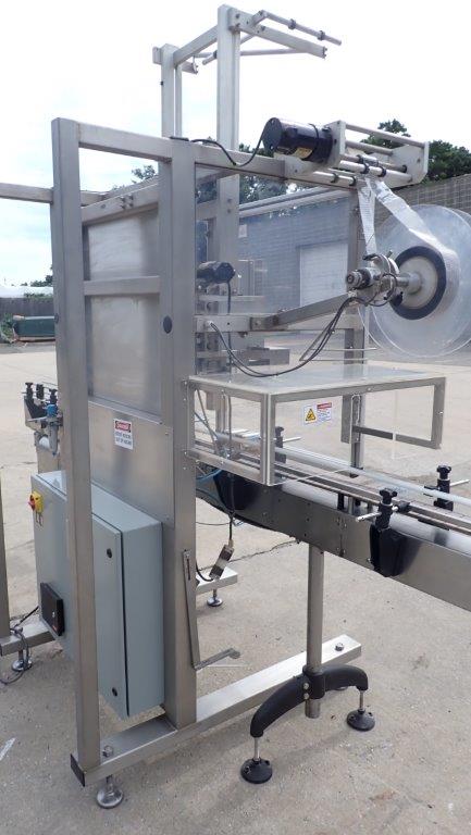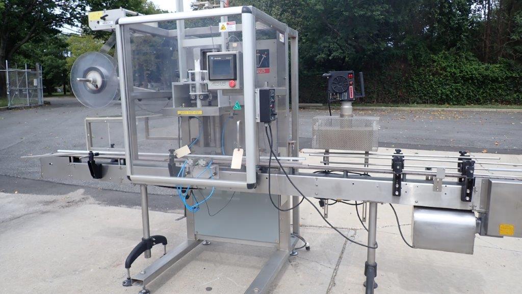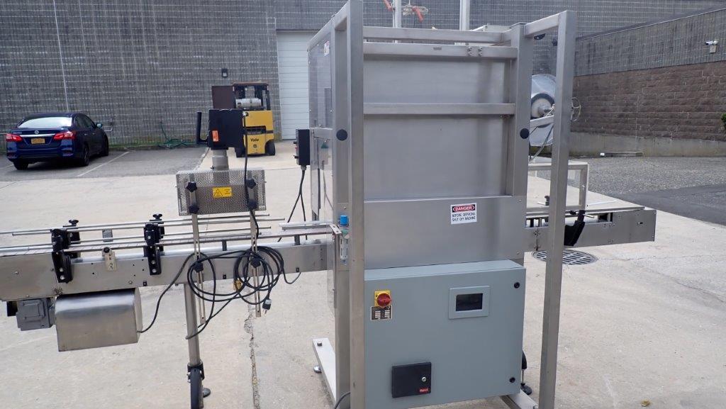 1-Used Aesus “Delta” Automatic Neck Banding/Sleeving Machine, S/N 322500609. Equipped with 140 In. long stainless steel conveyor with 4 In. wide plastic tabletop chain, this neck bander/sleever can operate up to approx. 180 containers per minute. Equipped with self-contained shrink tunnel, machine was last used on a packaging line for personal care products. With single phase, 60 cycle electrics. (Stock #8788)