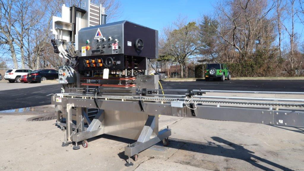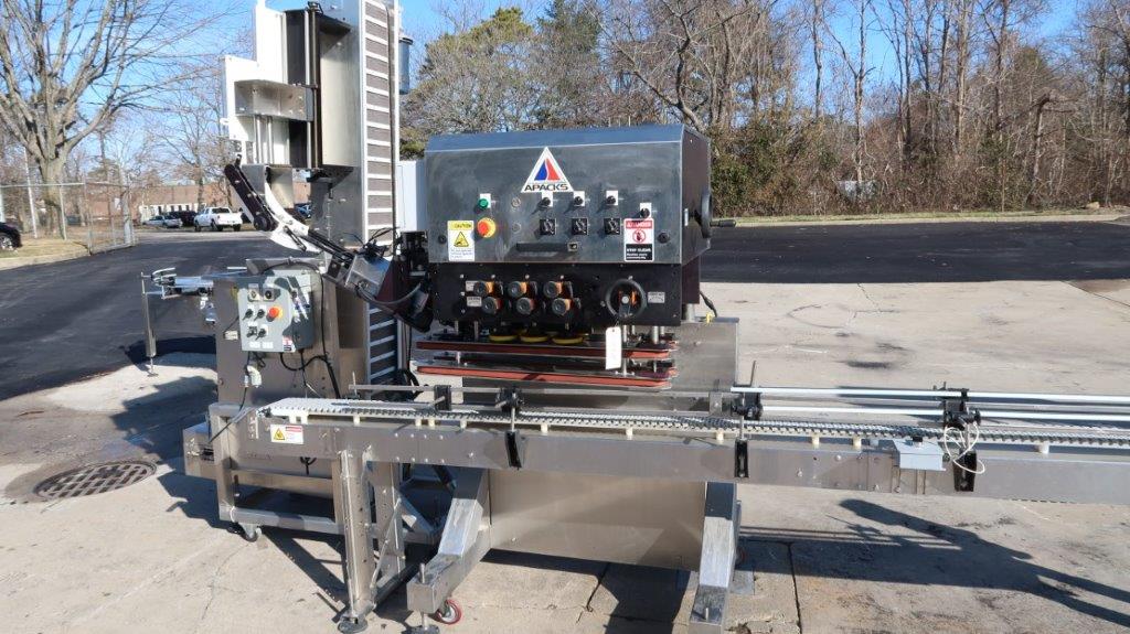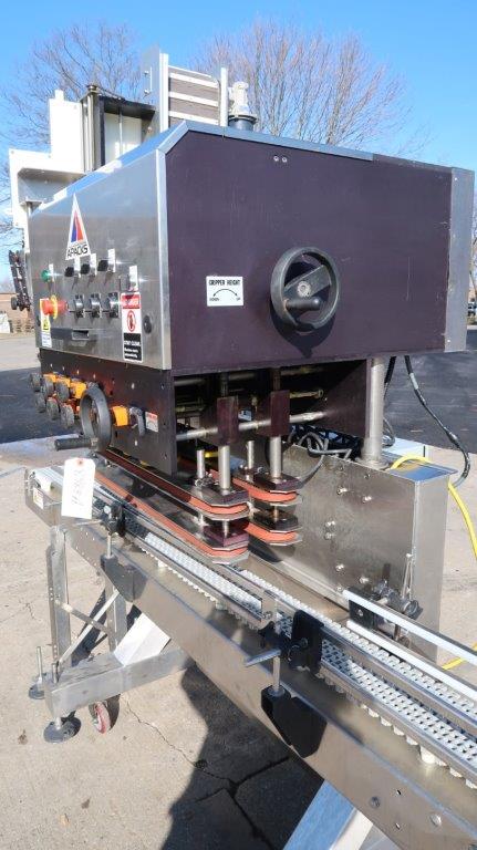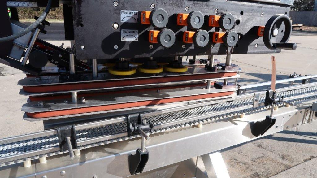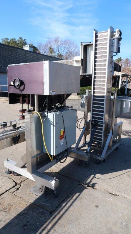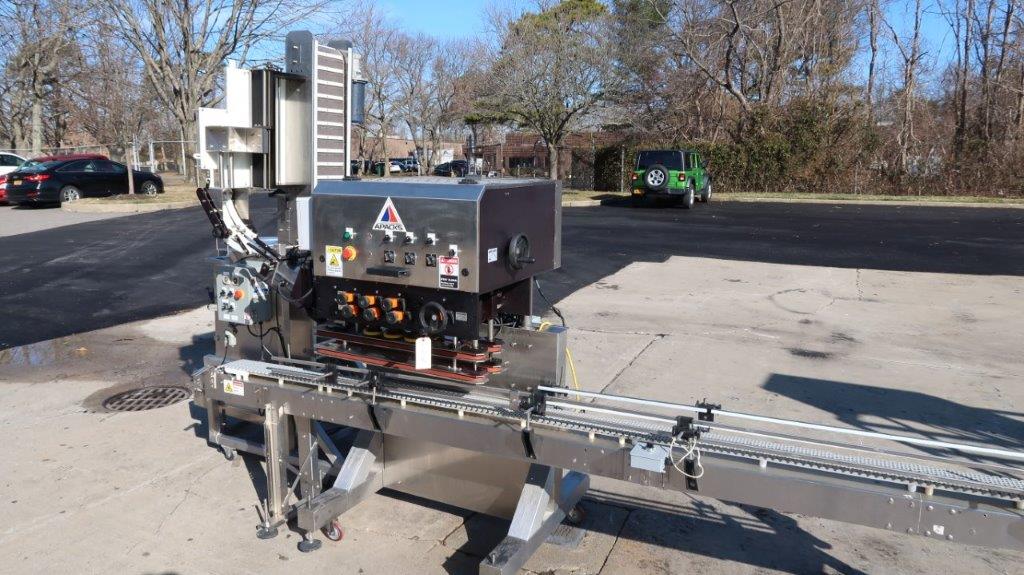 1-Used Apacks Six Spindle Automatic Screw Capping Machine, S/N 13105. Rated up to 200 containers per minute, according to operating manual, capper can handle cap diameters from 8mm diameter up to 120 mm diameter. With stainless steel framework, this adjustable capper has adjustments for cap diameter and container height, as well as adjustable two-tier gripper belts. With variable speed controls, machine is on casters for portability with electrical specifications of single phase, 60 cycle. Equipped with Apacks stainless steel cap hopper elevator with cap chute for automatic feeding of caps. Can be supplied with conveyor at an additional cost. (Stock #8484A)