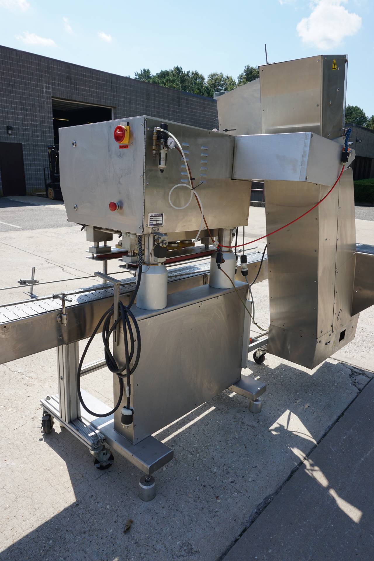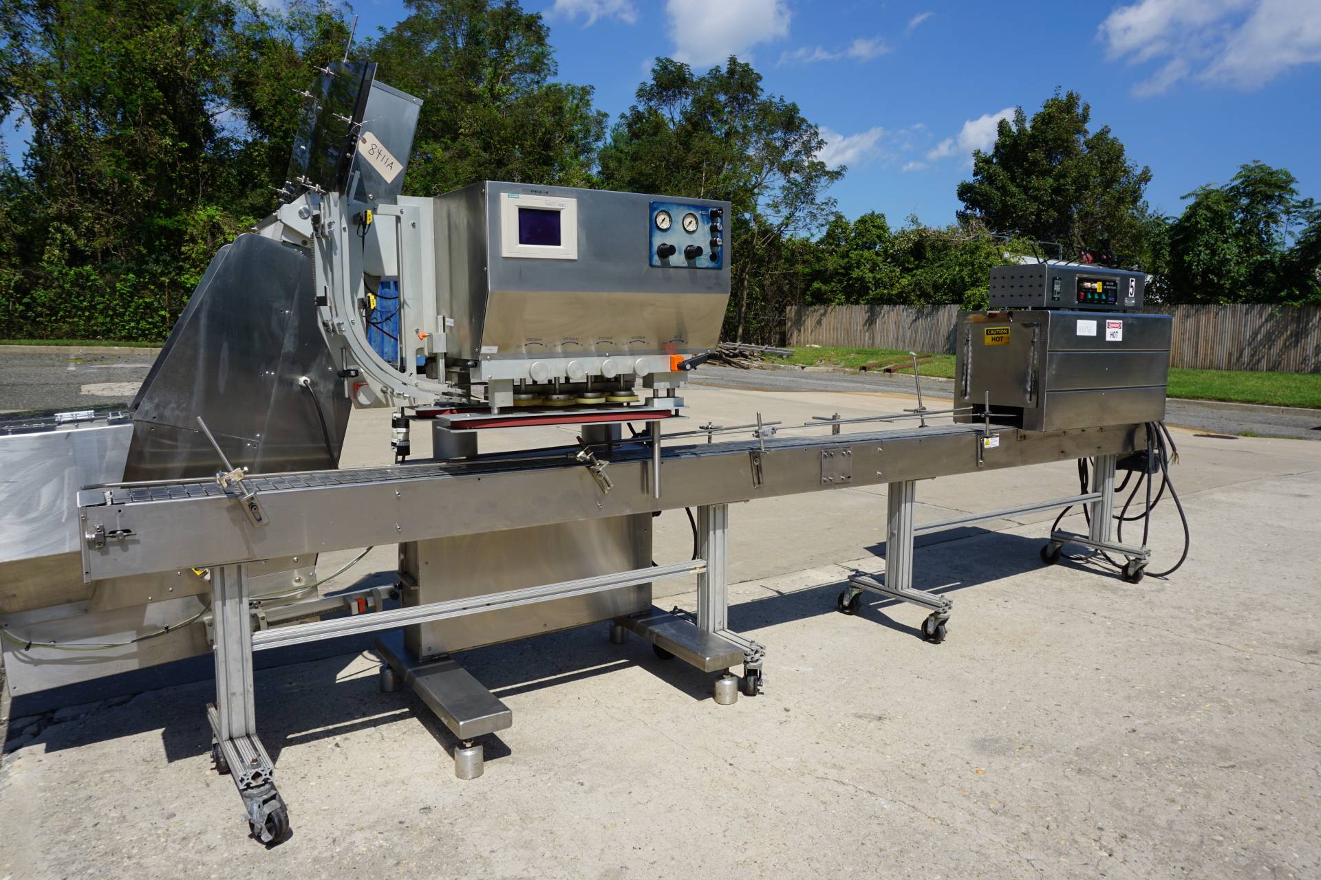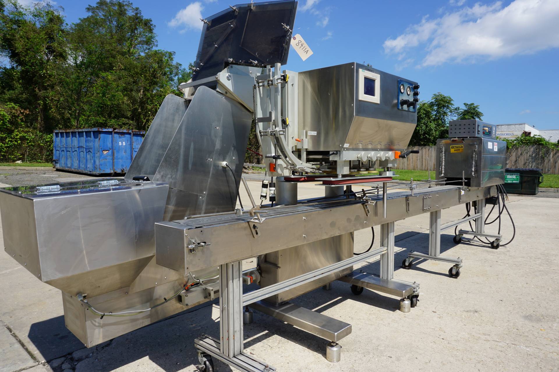 1-Used DL Tech Eight Spindle Automatic Inline Screw Capper Model DLCAP-4C, S/N 643-70103. Rated up to 200 containers per minute, machine comes equipped with integrated cap elevator. Mounted on stainless steel frame with casters, machine has cap chute with electric eye and adjustable spindles for different cap diameters. With front mounted Siemens “Simatic” Panel Machine. Last used in packaging of OTC products. Can be supplied with Conveyor and Shrink Tunnel shown at an additional cost. (Stock #8411A)