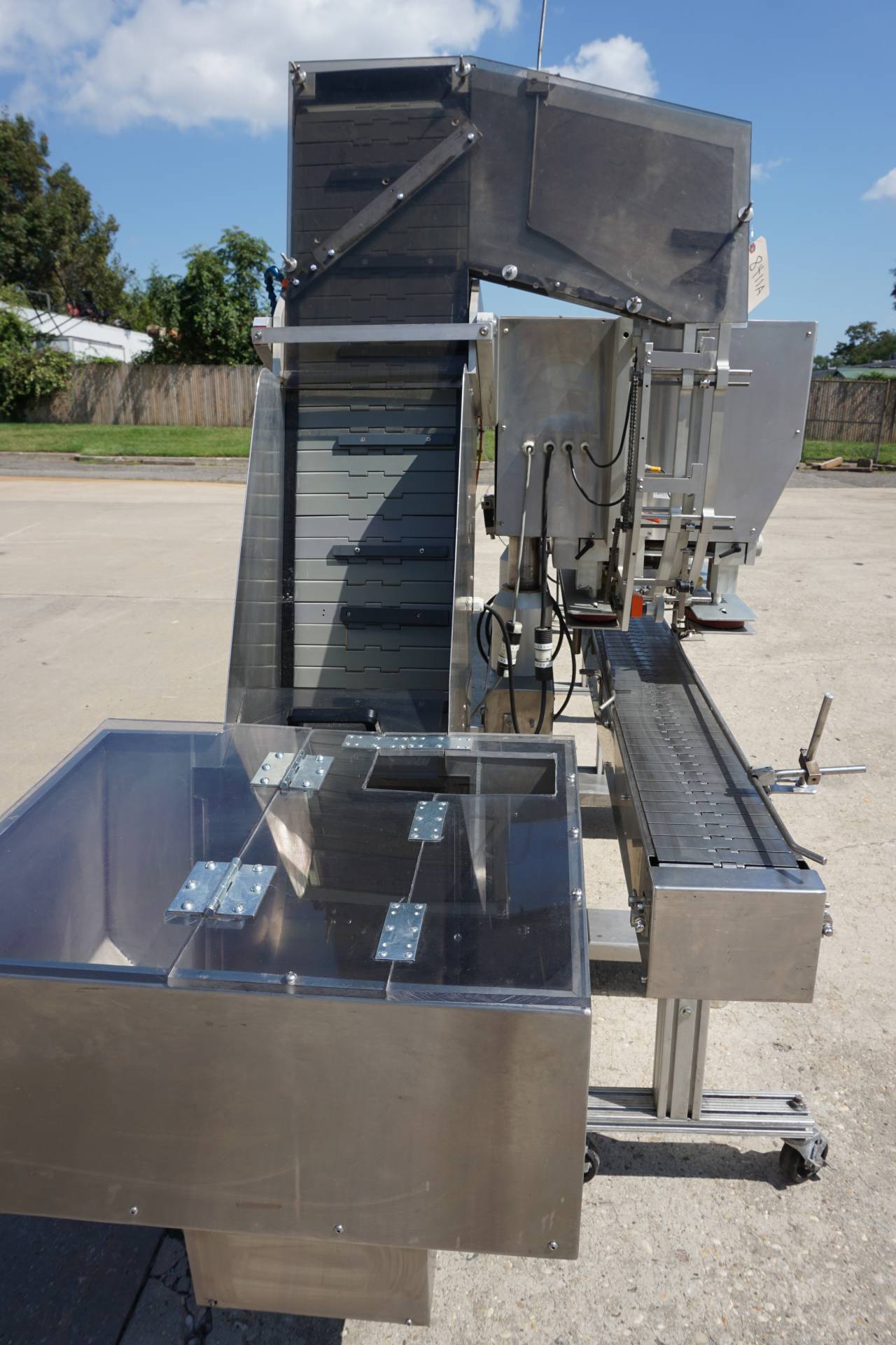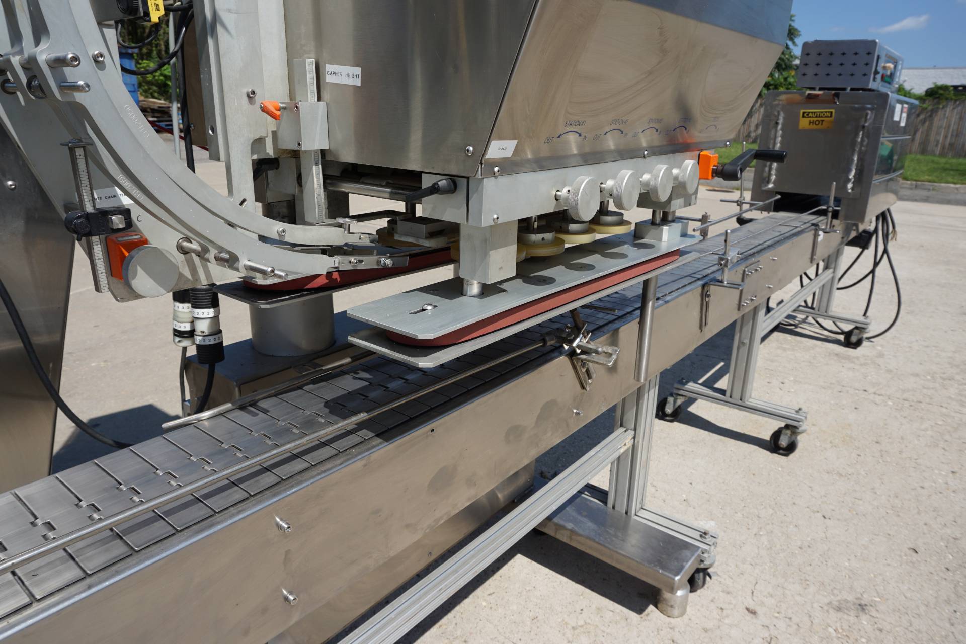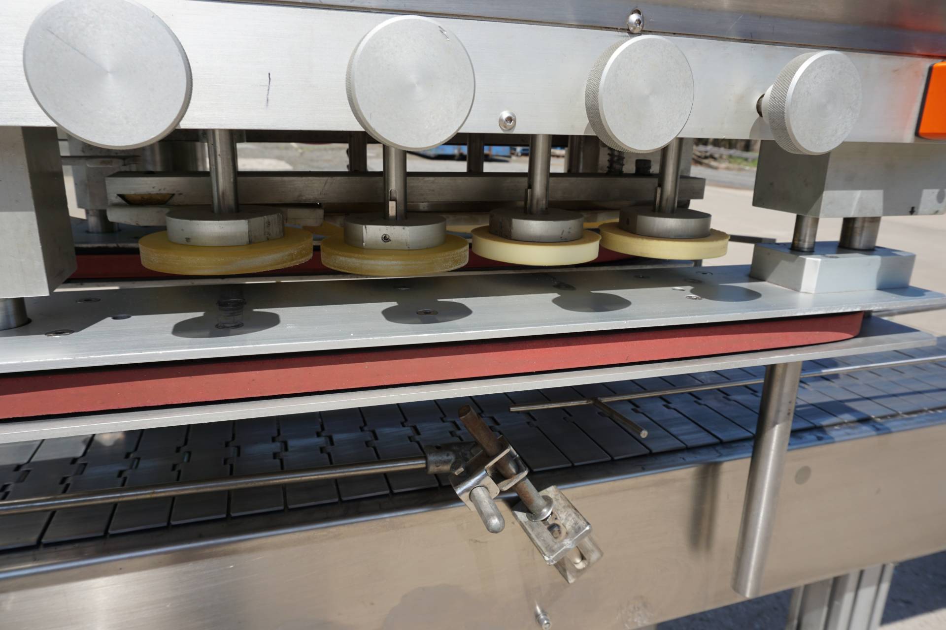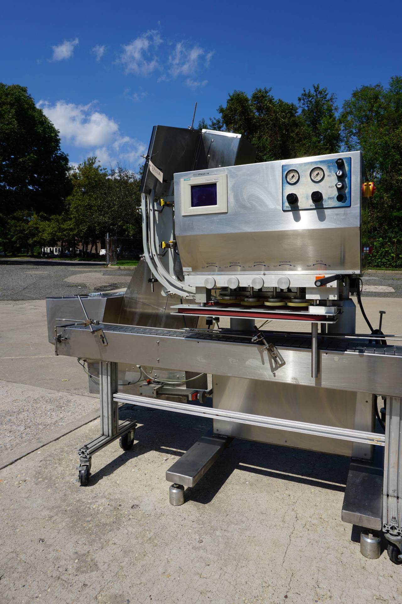 1-Used DL Tech Eight Spindle Automatic Inline Screw Capper Model DLCAP-4C, S/N 643-70103. Rated up to 200 containers per minute, machine comes equipped with integrated cap elevator. Mounted on stainless steel frame with casters, machine has cap chute with electric eye and adjustable spindles for different cap diameters. With front mounted Siemens “Simatic” Panel Machine. Last used in packaging of OTC products. Can be supplied with Conveyor and Shrink Tunnel shown at an additional cost. (Stock #8411A)