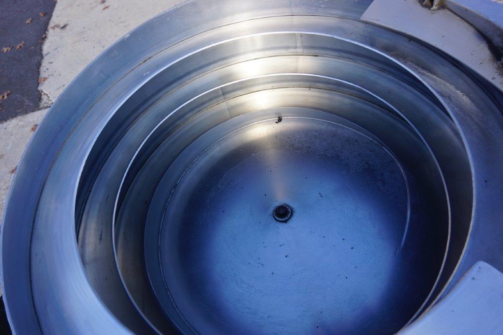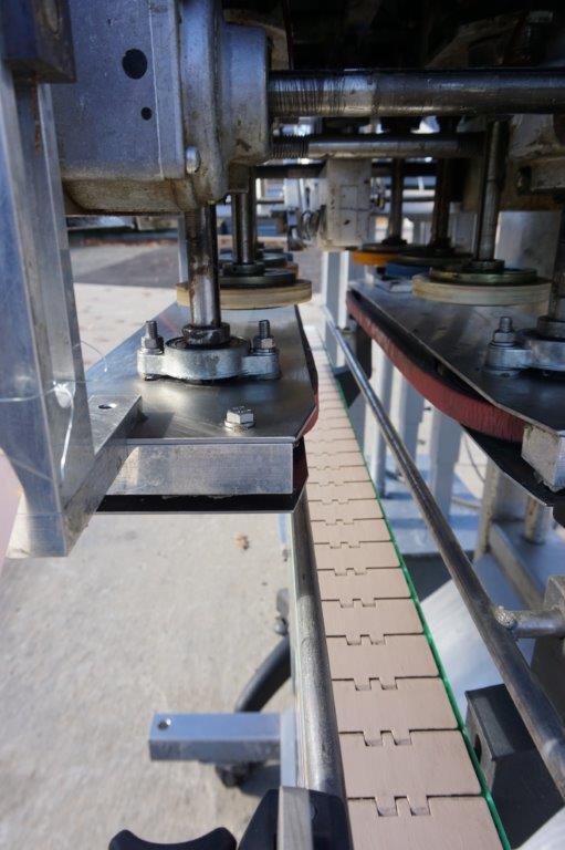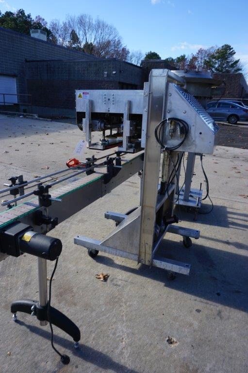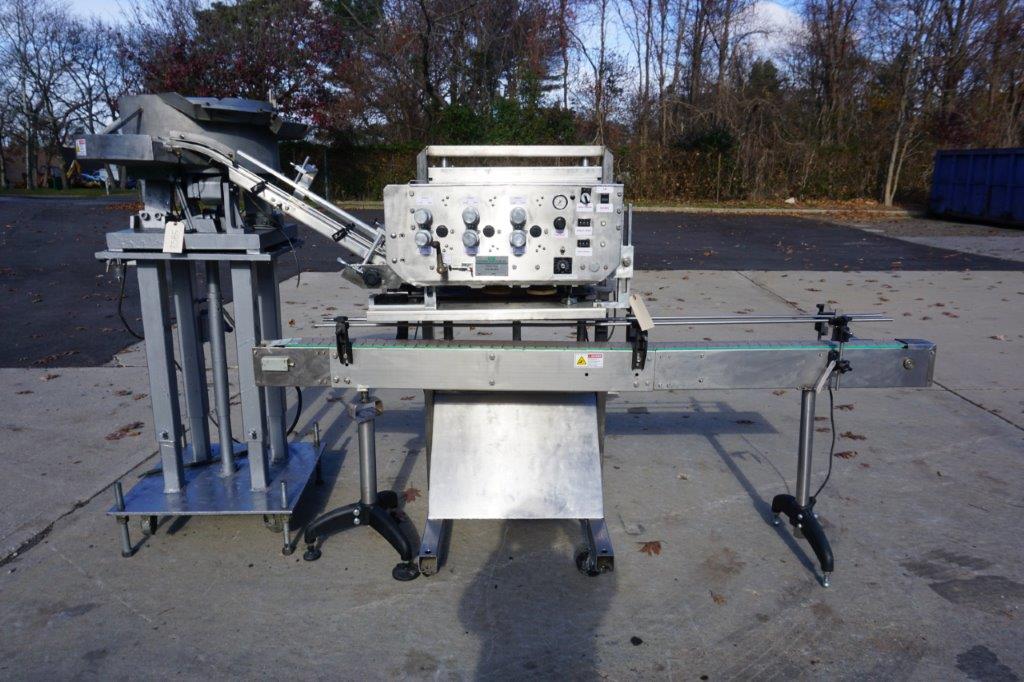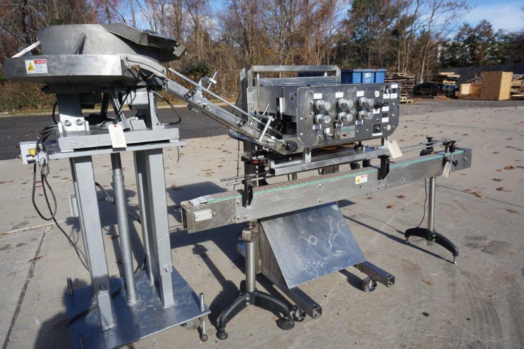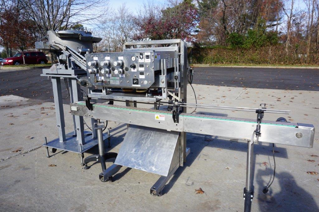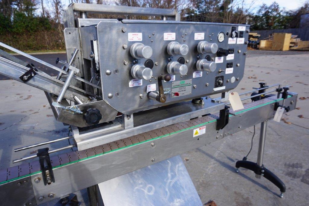 1-Used ELF Model CT600 Six Spindle Automatic Screw Capping Machine, Serial Number 920434. With stainless steel “C” frame, this adjustable capper is equipped with approximately 30 In. diameter cap feed bowl. Electric specifications Single phase, 60 cycle, 110 Volt. With cap chute and gripper belts, capper has variable speed operation for tightening wheels and gripper belts. For placement over customer’s existing conveyor, capper can be supplied with conveyor shown at additional cost. (Stock# 8585)