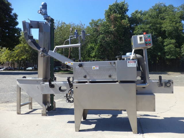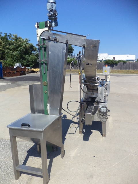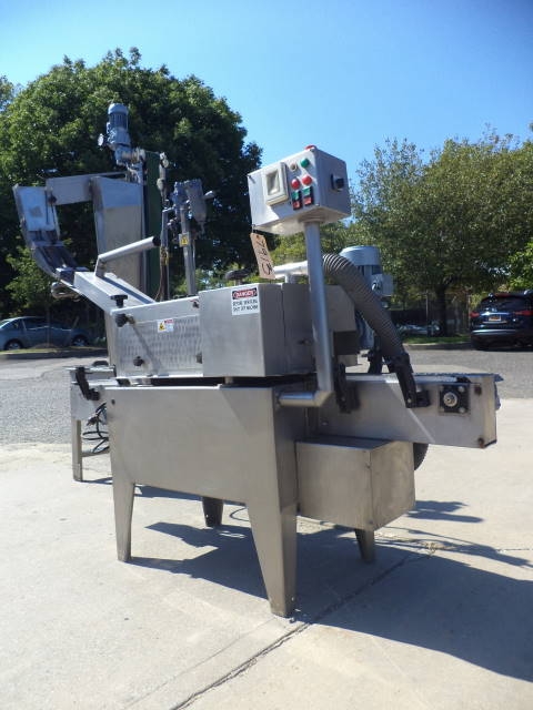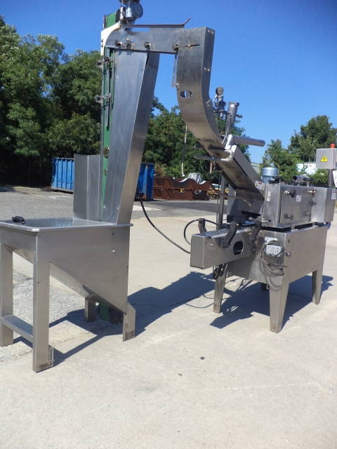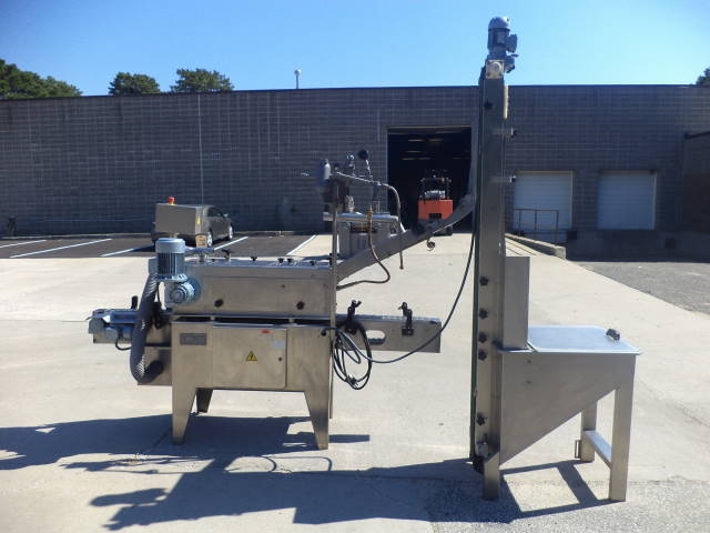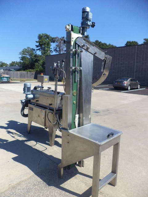 1-Used Emerito Model CT-2000 Stainless Steel Automatic Steam Capping Machine, Machine # 0514-E33. Rated up to approx. 150 containers per minute, machine was last used on caps up to 82mm diameter, Conveyor has approx. 4 in. wide tabletop chain and Capper comes equipped with Stainless Steel Automatic Magnetic Cap Elevator with Chute. (Stock #7913)