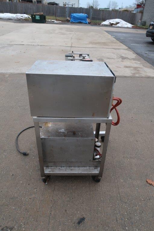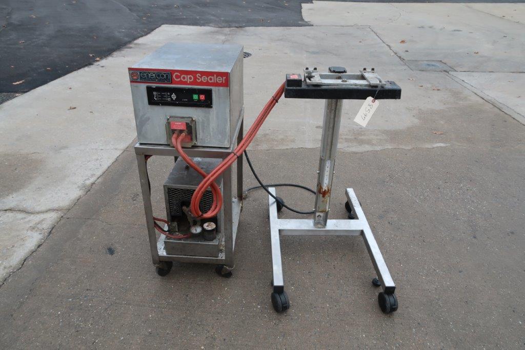 1-Used Enercon Cap Induction Sealer/Foiler, Serial number 12539-01.   Mounted on stainless steel cart with casters for portability, machine has single phase, 60 cycle, 115 Volt electrics.  With flat sealing head measuring 4-3/4 In. Wide, machine was last used in the food industry. (Stock #8597)