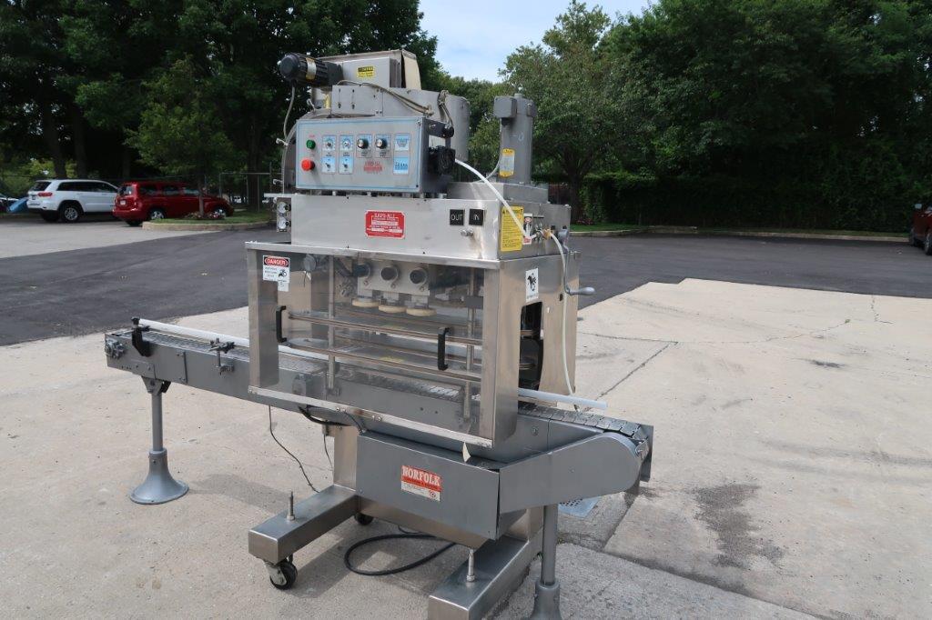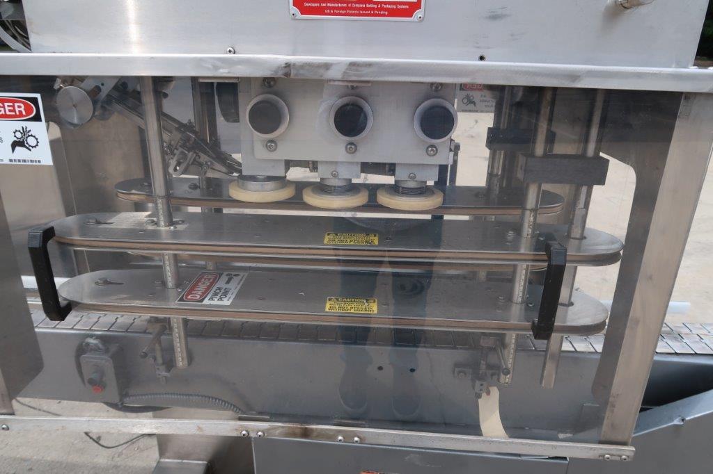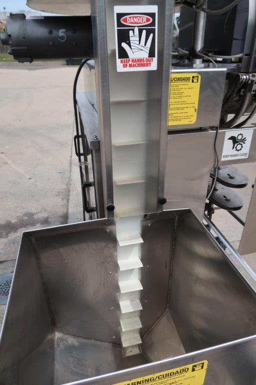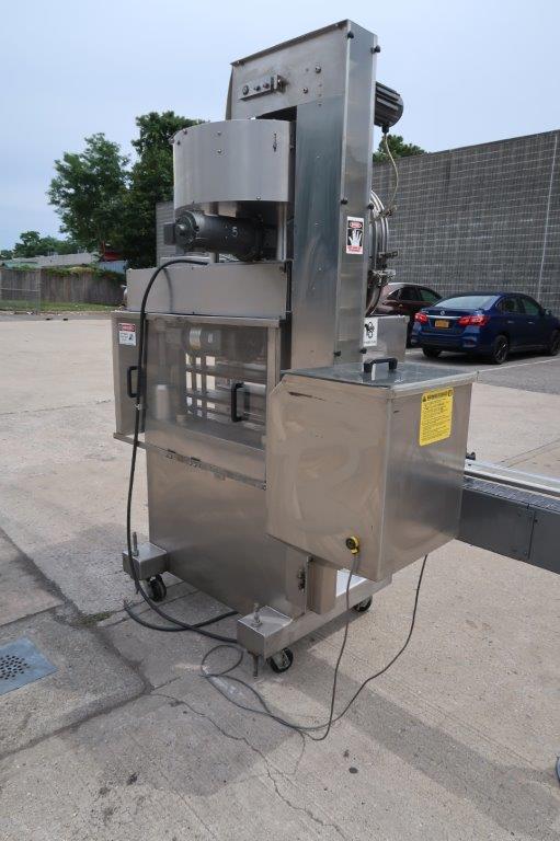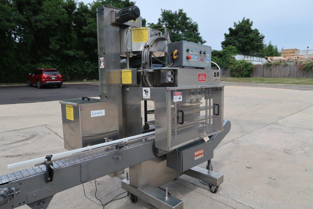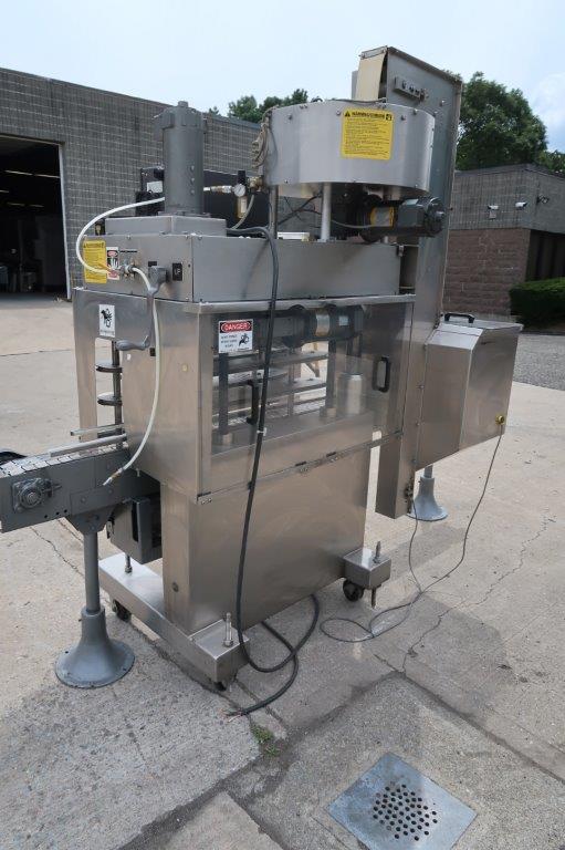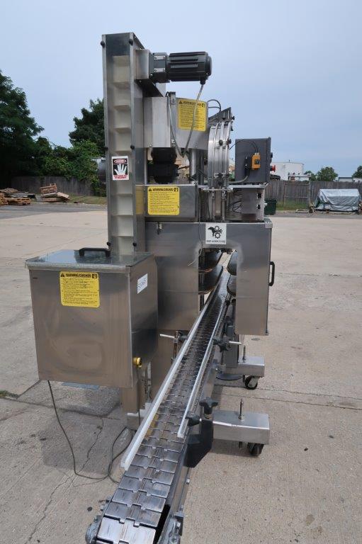 1- Used Kaps-All Model A6 Six Spindle Stainless Steel Automatic Screw Capping Machine, S/N 4404. Rated up to 200 containers per minute, capper has top mounted stainless cap feeder and side mounted cleated belt cap elevator for automatic feeding of caps. Machine is on casters for portability, capper can be supplied with optional conveyor shown, at additional cost. Machine has front mounted control panel with variable speed controls, capper has two-tier stabilizing gripper belts for tall containers as well. Electrical specifications 3 phase, 60 cycle, 220 volt. (Stock # 8536B)