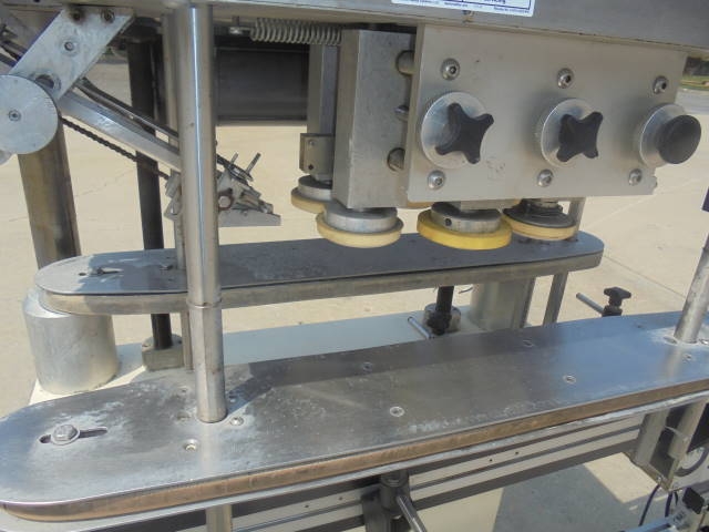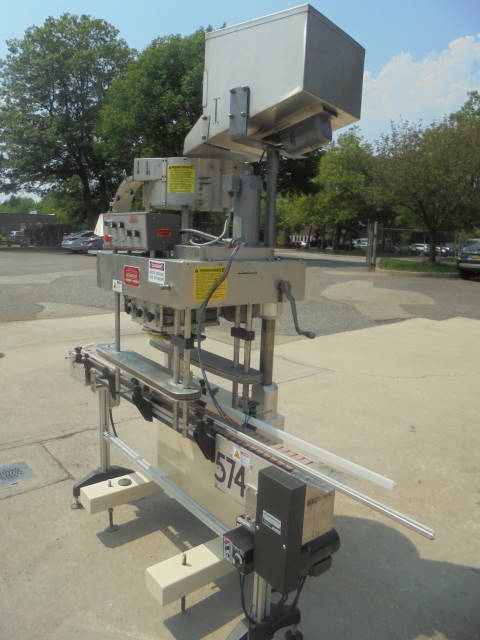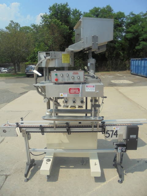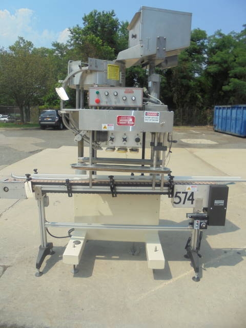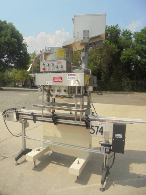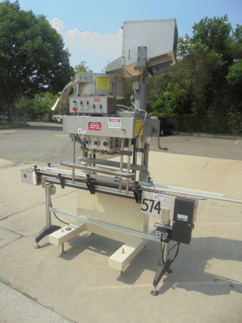 1-Used Kaps-All Model A6 Six Spindle Automatic Screw Capping Machine, S/N 4303. Rated up to 150 containers per minute, Capper has top mounted stainless steel Centrifugal Bowl Feeder and stainless steel Bulk Supply Cap Hopper. Equipped with Self-Contained Control Panel with variable speed controls, Capper has 3/60/220 volt electrics. For placement over customer’s existing Conveyor, Capper can be supplied with Conveyor shown in photographs at additional cost. (Stock #8120C)