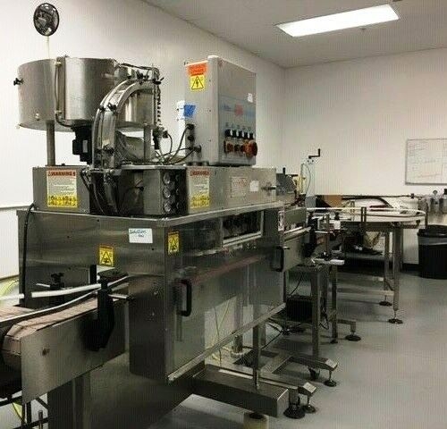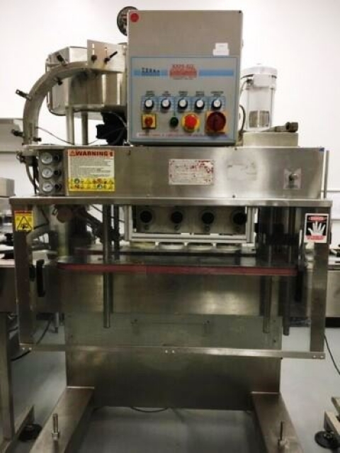 1-Used Kaps All Model C-8 Fully Automatic Eight Spindle Capping Machine. Rated up to approx. 200 containers per minute, machine has stainless steel frame and is equipped with top-mounted centrifugal bowl and cap chute. Conveyor shown is not available, but an alternate conveyor can be provided at an additional cost. Electrical specifications 3/50-60/208-220 volt. Last used in the food industry. (Stock #L1333)