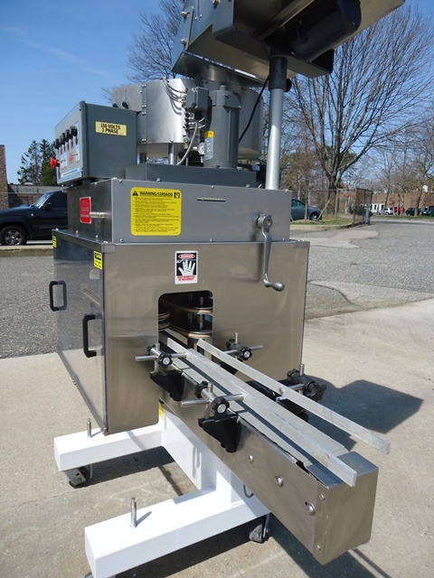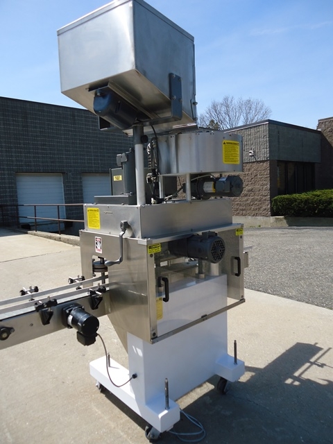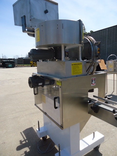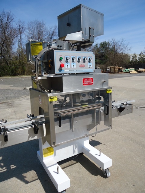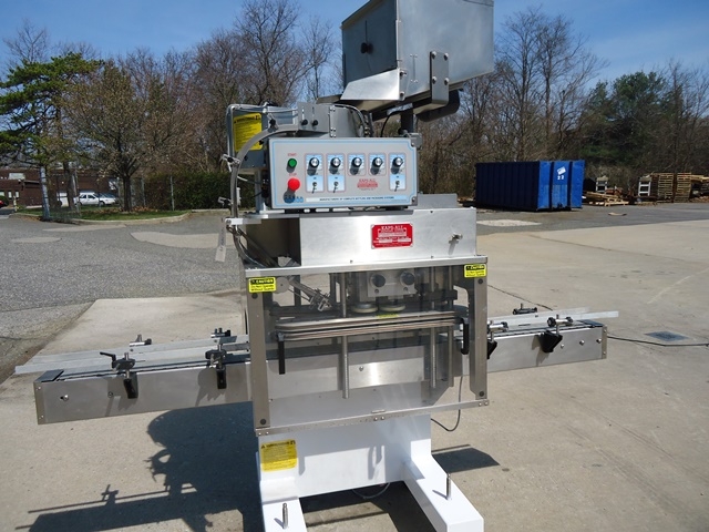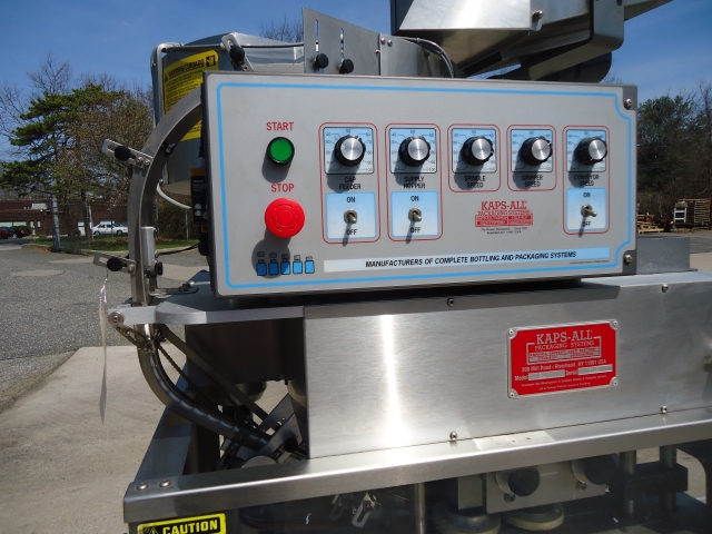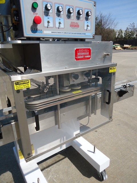 1-Used Kaps-All Model E4 Four Spindle Automatic Screw Capper, S/N 5042. Rated up to 80 containers per minute, Capper has self-contained control panel with variable speed controls for spindles, gripper belts, conveyor, etc. Equipped with approx. 90 in. long Conveyor with plastic tabletop chain. On casters for portability, Capper has approx. 24 in. diameter top mounted Centrifugal Bowl Feeder and Cap Bulk Supply Hopper with Vibratory Motor. Electrics: single phase, 60 cycle, 110 volt. (Stock # 8084A)