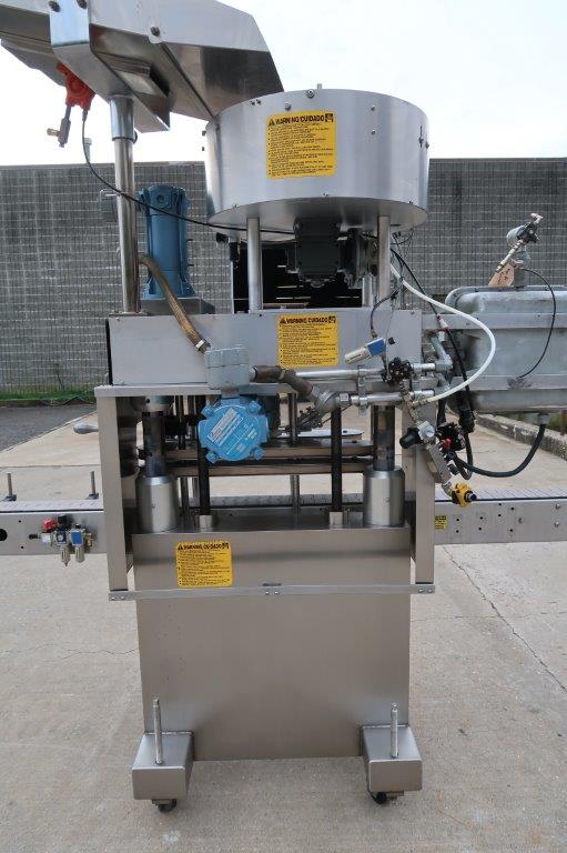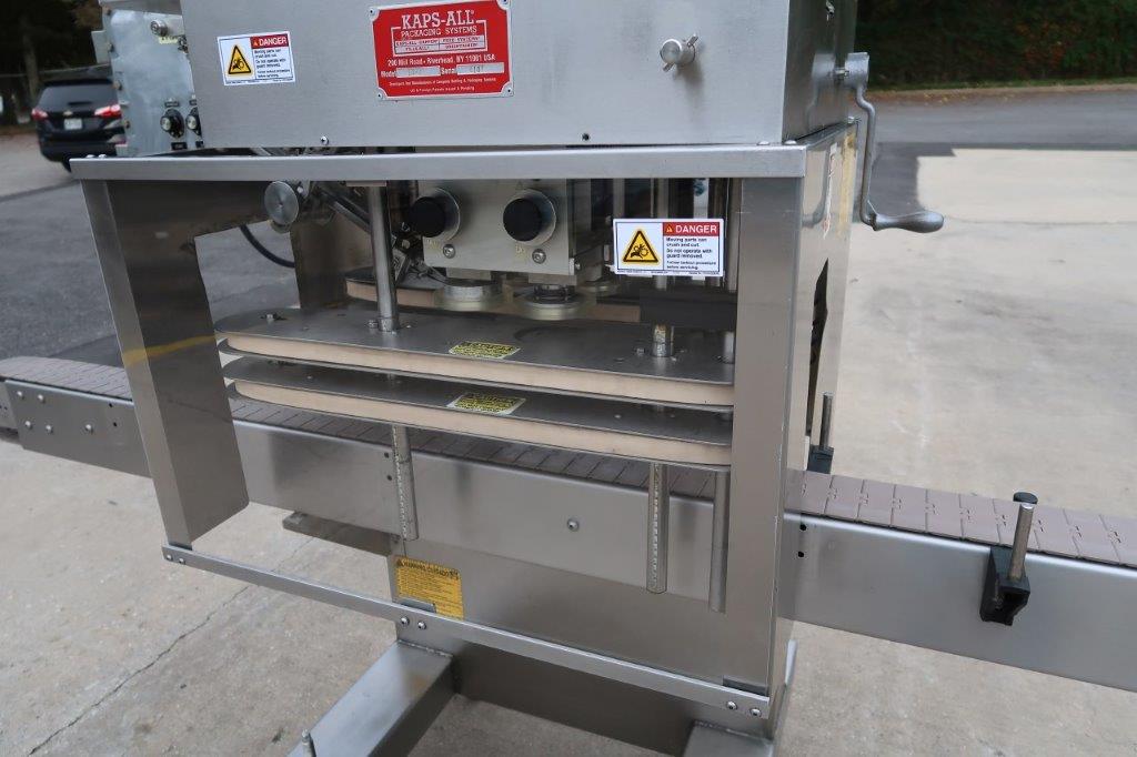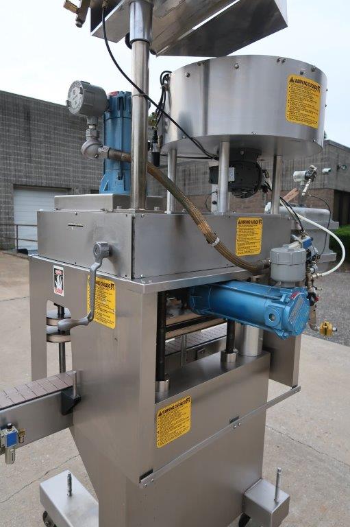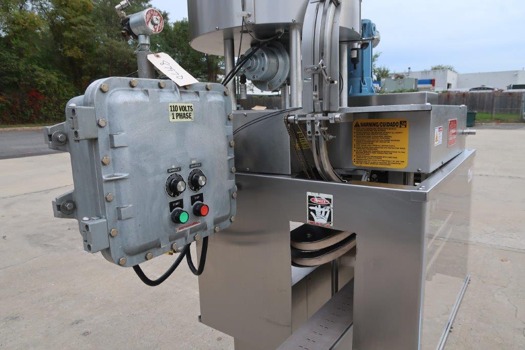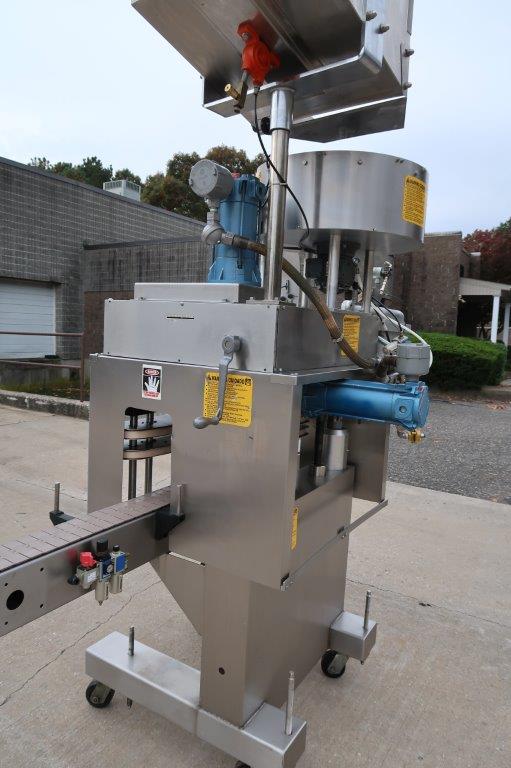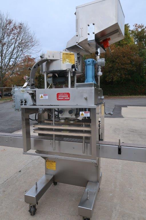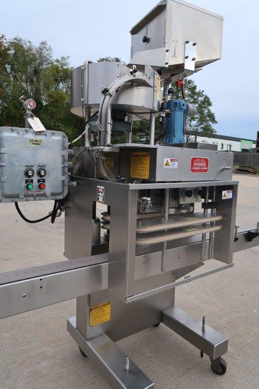 1-Used Kaps-All Model E4-X Four Spindle Stainless Steel Automatic Explosion Proof Screw Capping Machine, Serial Number 4147.  Rated up to 80 containers per minute, machine is on casters for portability. With single phase 110 Volt electrics, machine has top mounted centrifugal cap feeder with bulk supply cap hopper.  With front mounted explosion proof control box with variable speed controls. Capper can be utilized over customer’s existing conveyor, or we can supply conveyor shown in photos at additional cost. (Stock #8797D)