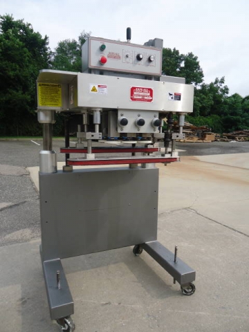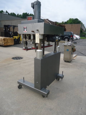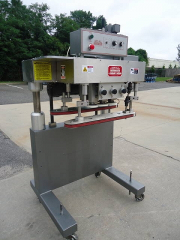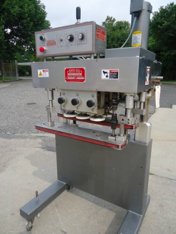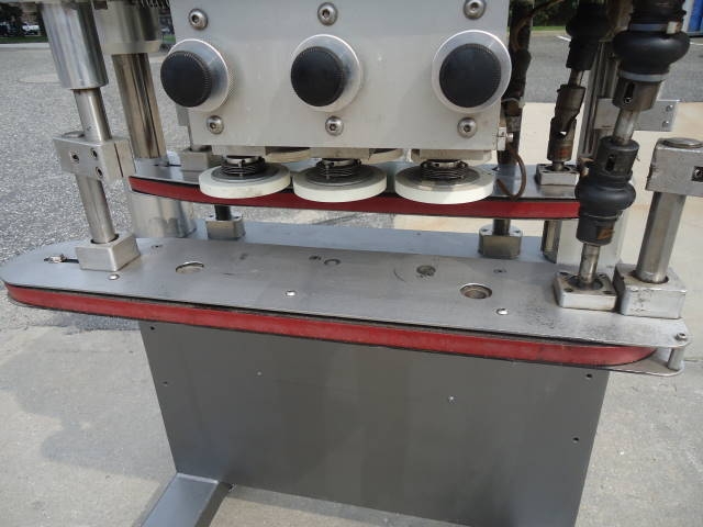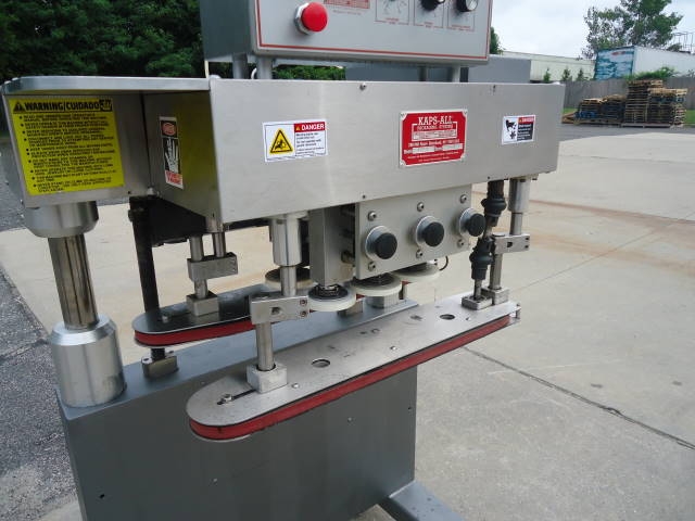 1-Used kaps-all model f-6-s six spindle cap tightener/retorquer, s /n 3447. Mounted on casters for portability, unit designed for placement over customer’s existing conveyor. With variable speed control for spindles and gripper belts. (stock # 7514d)