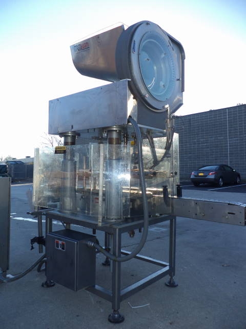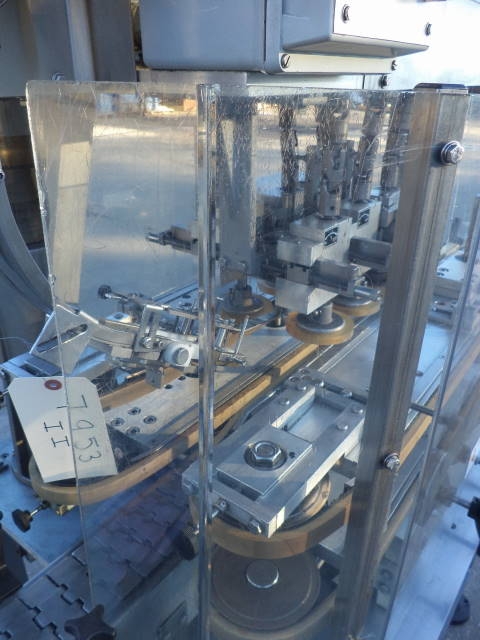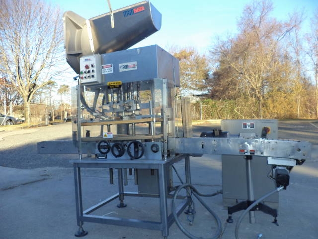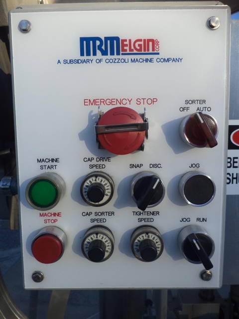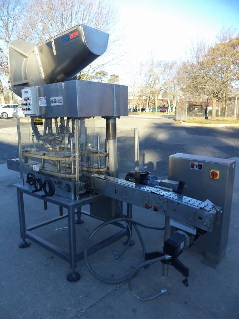 1-Used MRM/ELGIN VERSA-CAP III Automatic Screw Capping Machine, S/N VSCAP157. Rated up to 150 caps per minute, Capper has two tier stabilizing gripper belts and approx. 9 ft. long Stainless Steel Conveyor. Equipped with top mounted hopper and cap chute with electric eye. Supplied with various cap sorting discs for different size caps. Electrical specifications 3 phase, 60 cycle, 230 volt. Equipped with starter box. (Stock #7953ii)