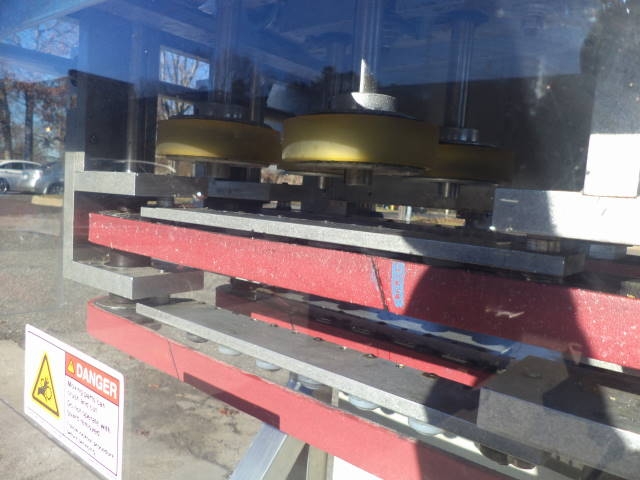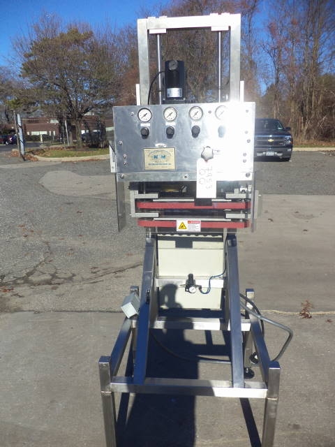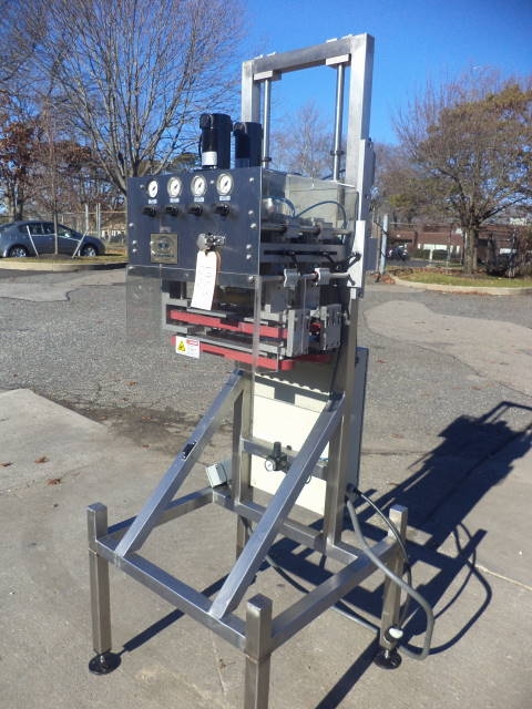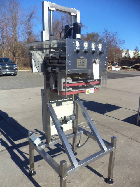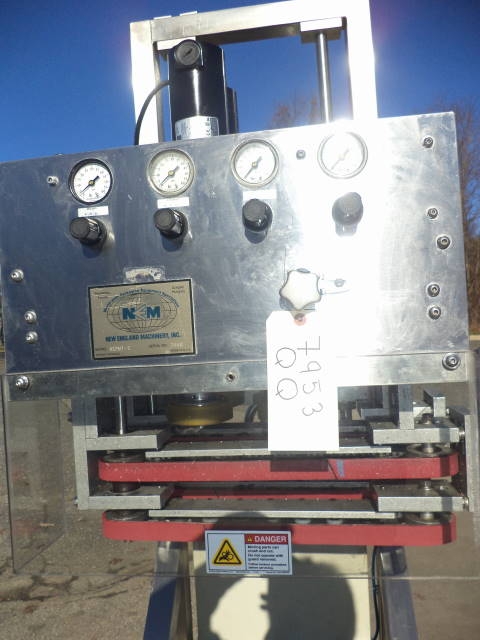 1-Used New England Machine Four Spindle Cap Tightener Model NEPMT-2,S/N 7448.  Mounted on stainless steel stand, Tightener has two tier stabilizing belts and single phase, 60 cycle, 220 volt electrics.  (Stock #7953QQ)