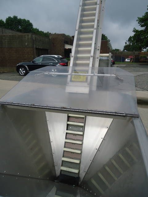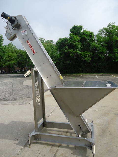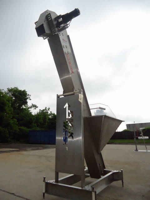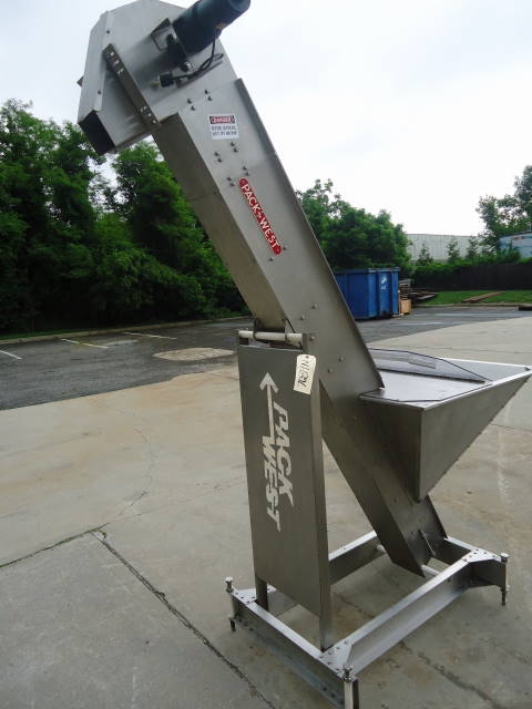 1-Used pack west stainless steel inclined cleated belt cap elevator/feeder, s/n ce-1840. With approx. 96 in. Discharge height, feeder has top mounted fractional horsepower motor. With approx. 6 in. Wide belt with approx. 1-1/2 in. High cleats. Cleats on approx. 2-1/2 in. Centers, “cleat to cleat”. (stock #7689n)