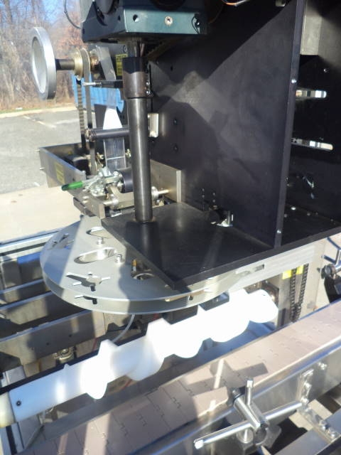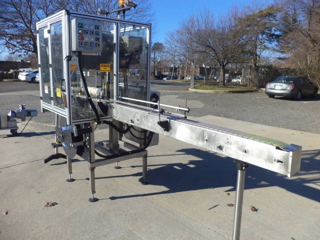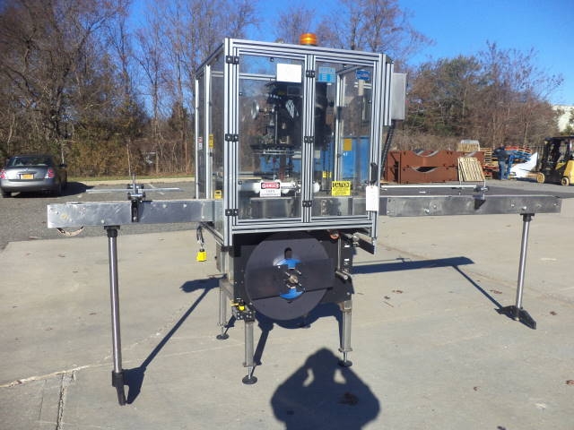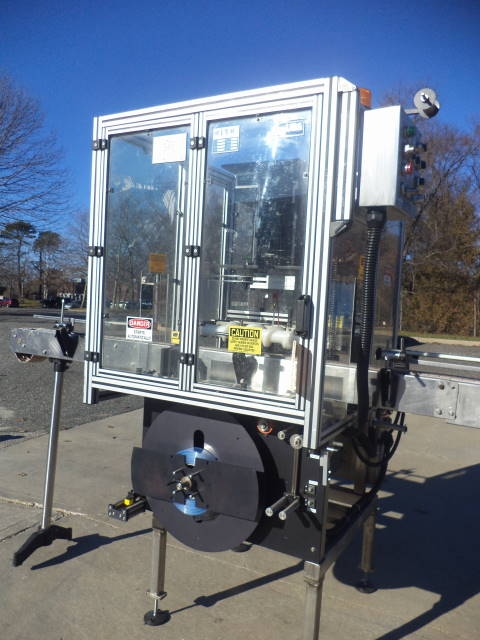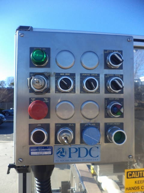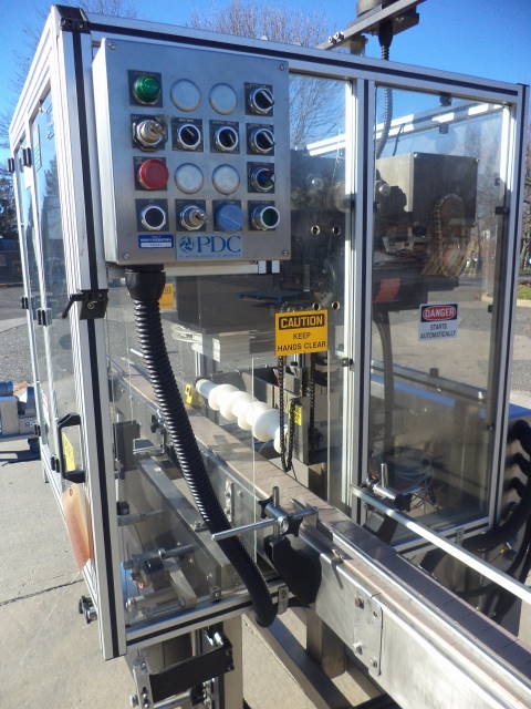 1-Used PDC Model 65-M High Speed Tamper Evident Neck Bander/Sleever, Serial Number 236. Rated up to 200 containers per minute, machine has worm infeed and electrical specifications single phase, 240 volt. With approximately 96 inch long conveyor, machine is capable of applying vertical perforated neck bands, neck bands with tear tabs, as well as horizontally perforated full sleeves. (Stock #7953GG)
