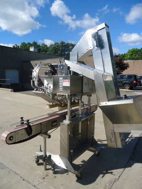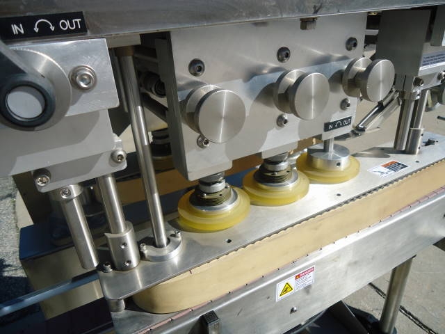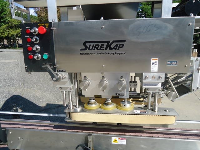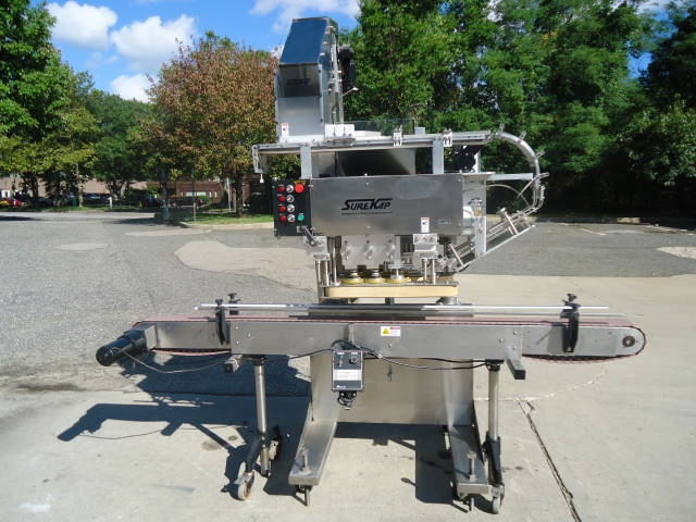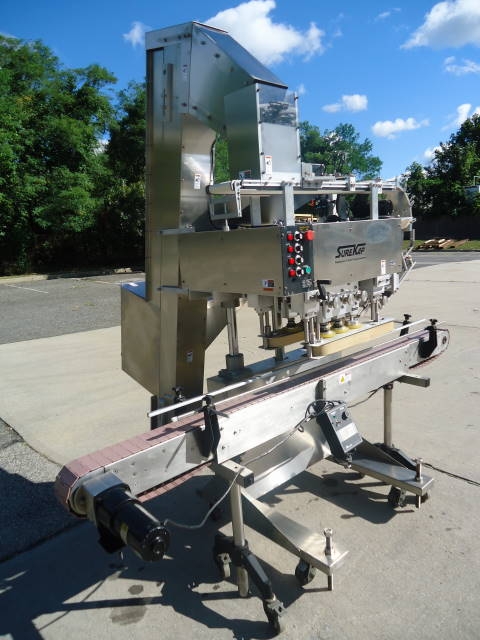 1-Used Surekap Model SK6000-BF6 Six Spindle Automatic Screw Capping Machine, Serial Number PA 18399.  Rated up to 120 containers per minute, machine has stainless steel cabinetry and is on casters for portability.  Equipped with self-contained stainless steel cap elevator with hopper, capper has adjustments for spindles and stabilizing belts.  For placement over customer’s existing conveyor (conveyor in photos not included).  Features include non-vibratory high speed belt feeder designed for maximum efficiency and versatility.  (Stock #8031A)