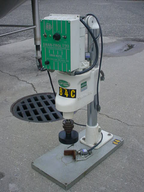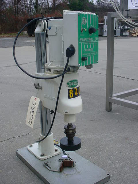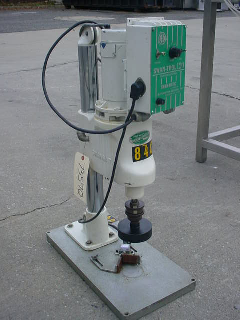 1-Used swanmatic model 60-pc-2835 semi-automatic tabletop capper. With variable speed control, capper driven by 1/4 hp single phase, 60 cycle electric motor.