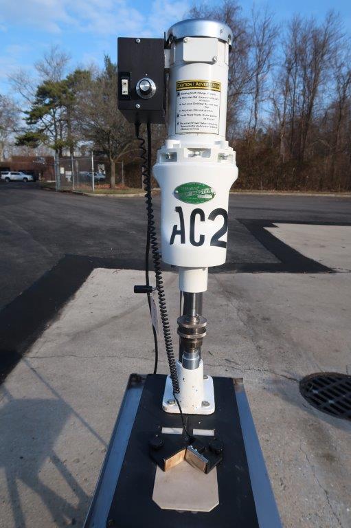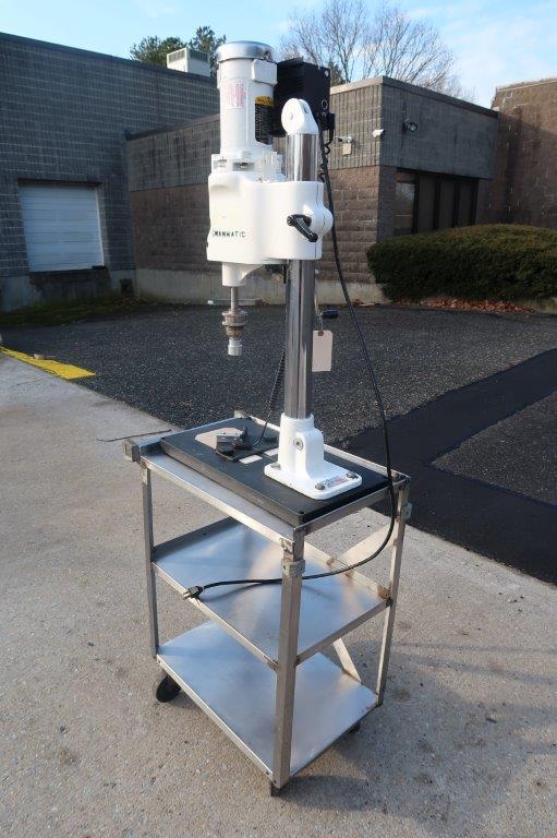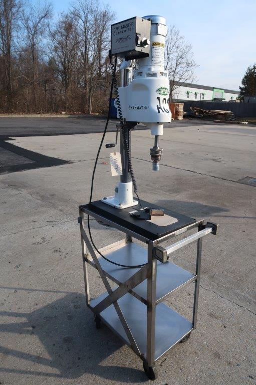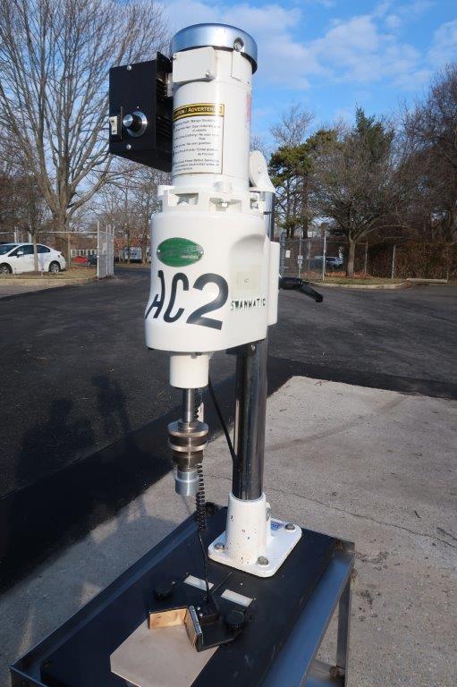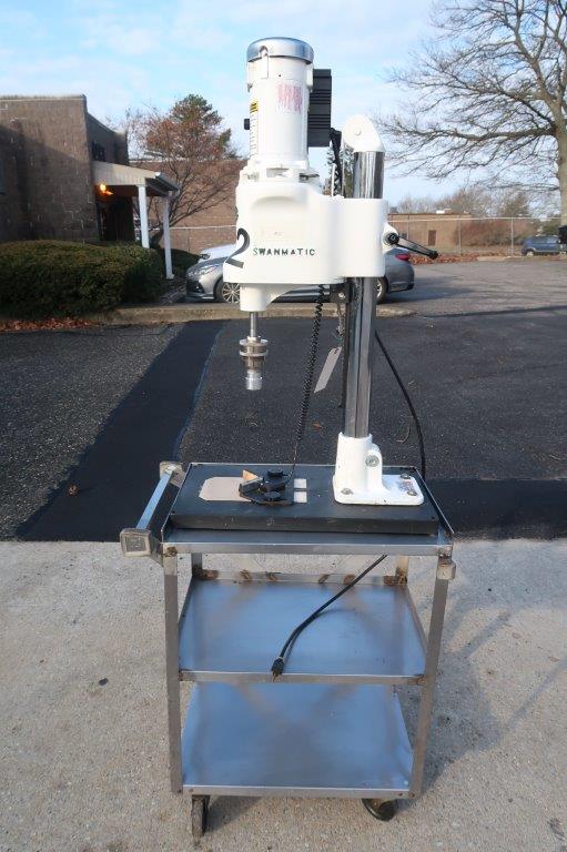 1 – Used Swanmatic Model C300 Tabletop Semi-Automatic Capping Machine, S/N C300-4537. Mounted on portable stand with casters, capper has fractional HP motor with variable speed control and table mounted container switch for activating capping cycle (Stock # 8718ZC)