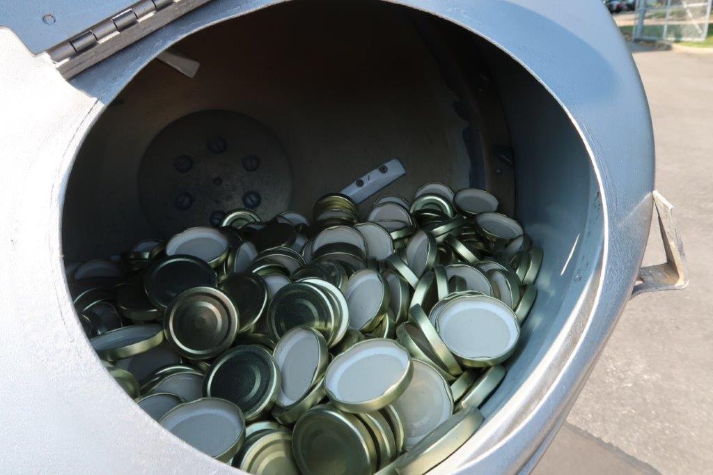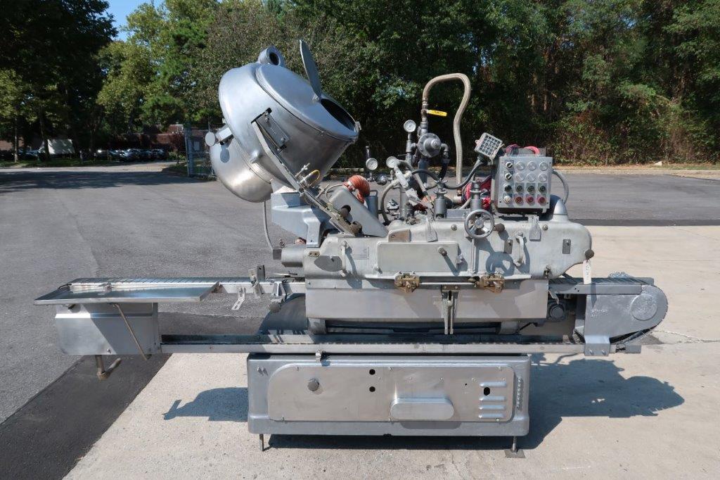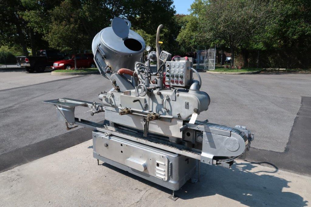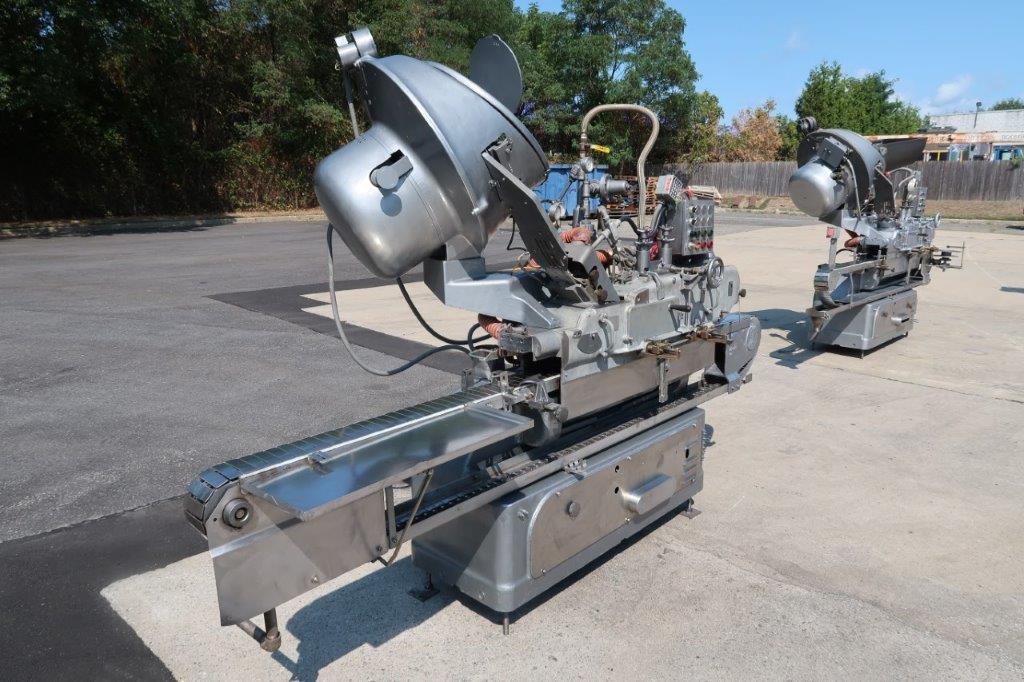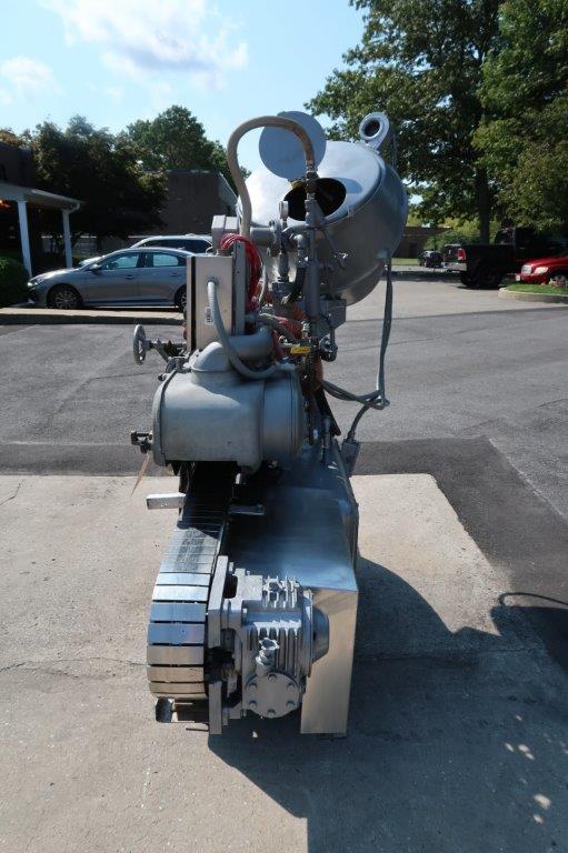 1-Used White Cap Model VG Automatic Steam Capping Machine, Serial Number 1877-LJG. Last used on approximately 2 In. diameter cups, machine can handle larger caps as well. Equipped with top mounted White Cap hopper and cap chute. With 4.5 In. wide tabletop conveyor chain, machine has front mounted control panel. Last used in major food manufacturing facility. (Stock #8674D)