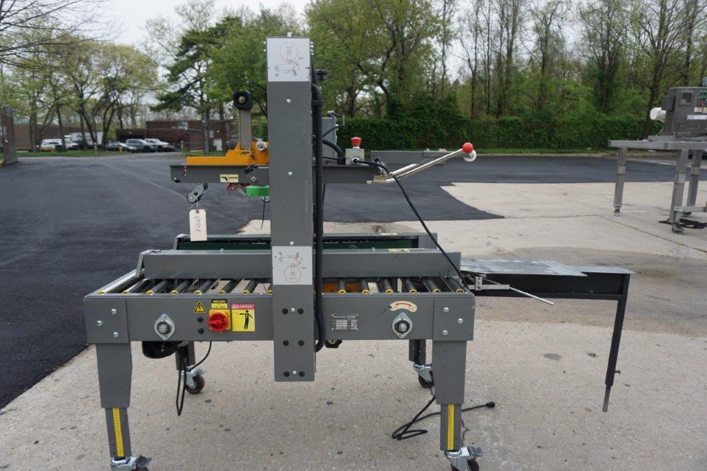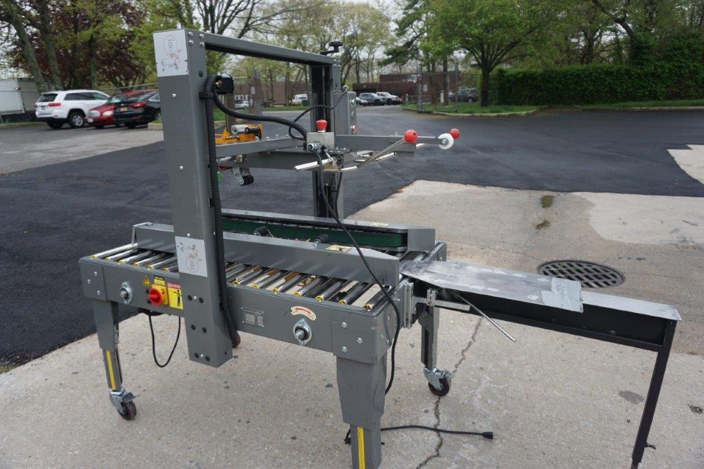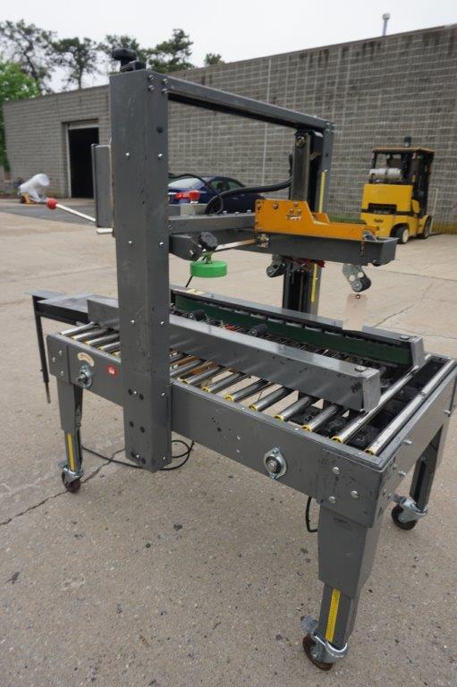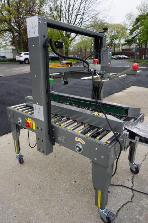1-Used Packaging Systems Top and Bottom Adjustable Case Taper, S/N 0902016.  Equipped with motorized side belts, taper is on casters for portability. Electrical specifications single phase, 60 Cycle, 110 Volt. (Stock #8497K)