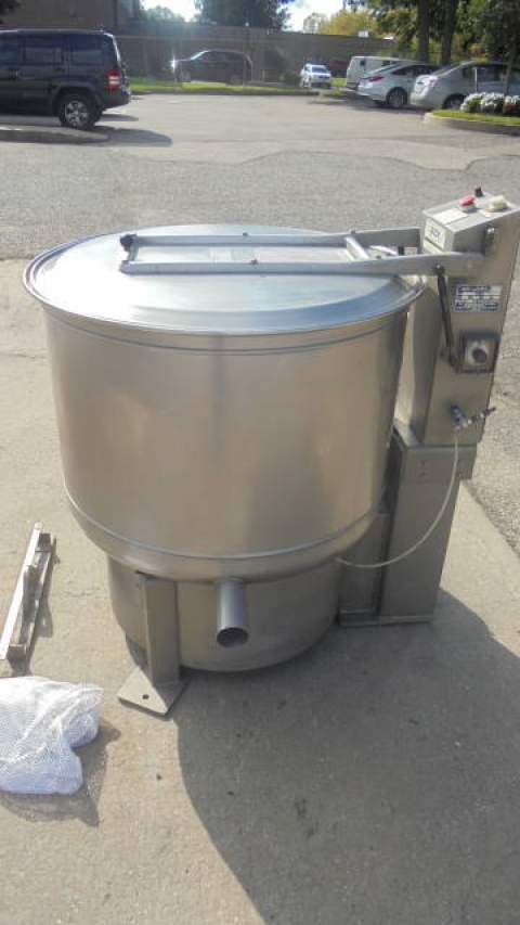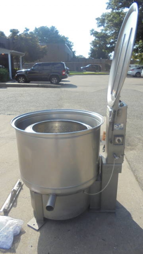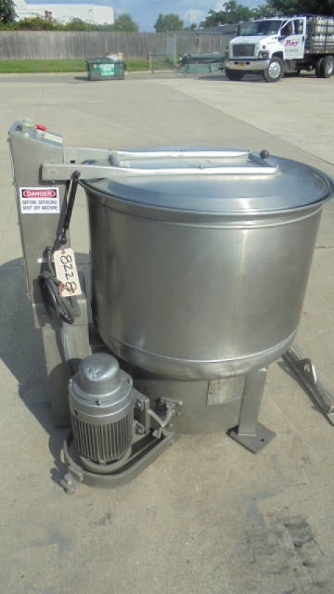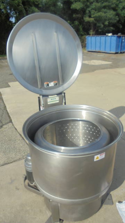 1-Used Bock Model FP-90 Food Processing Perforated Basket Centrifuge, S/N FP903317. With approx. 30 in. diameter perforated bowl, machine is under-driven by 5 HP 3/60/230-460 volt motor. With hinged lid, typical applications include de-watering salad vegetables, de-watering Chinese vegetable, removing oil from meats, drying bean sprouts, etc. (Stock #8228)