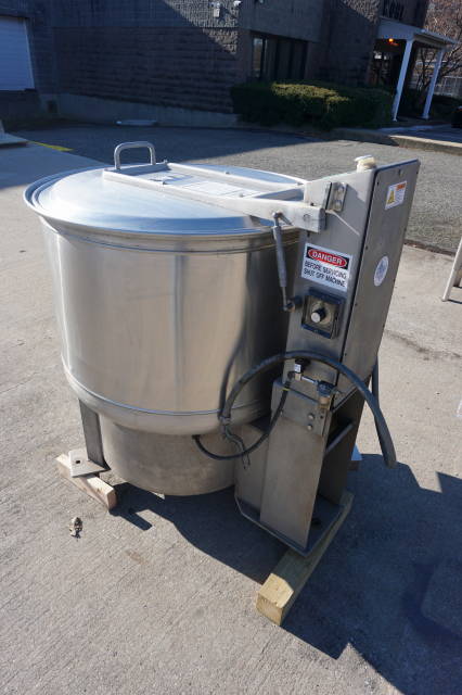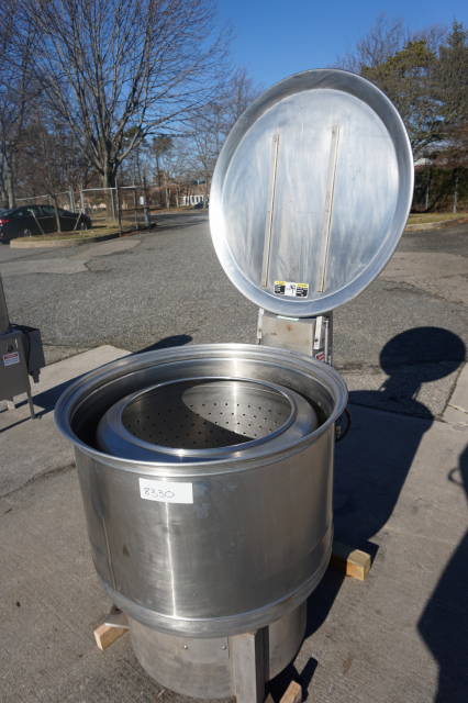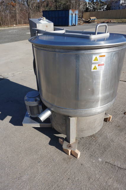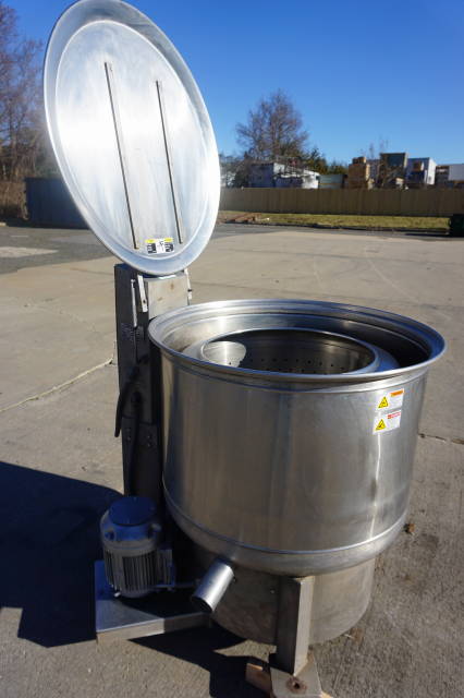 1-Used Bock Model FP-90 Food Processing Perforated Basket Centrifuge, S/N FP903425. With approx. 30 in. diameter perforated bowl, machine is underdriven by 5 HP 3/60/230 volt motor. With hinged lid, typical applications include de-watering salad vegetables, de-watering Chinese vegetables, removing oil from meats, drying bean sprouts, etc. (Stock #8330)