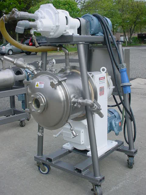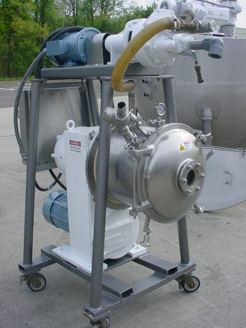1-USED CORNELL MACHINE COMPANY MODEL D-16 STAINLESS STEEL SANITARY VERSATOR, S/N 9165. MOUNTED ON PORTABLE STAND WITH CASTERS, UNIT HAS STAINLESS STEEL STARTER BOX AND IS DRIVEN BY 7.5 HP 3/60/230-460 VOLT VARIABLE SPEED EXPLOSION PROOF DRIVE MOTOR. SUPPLIED WITH TOP MOUNTED 5 HP VACUUM PUMP.