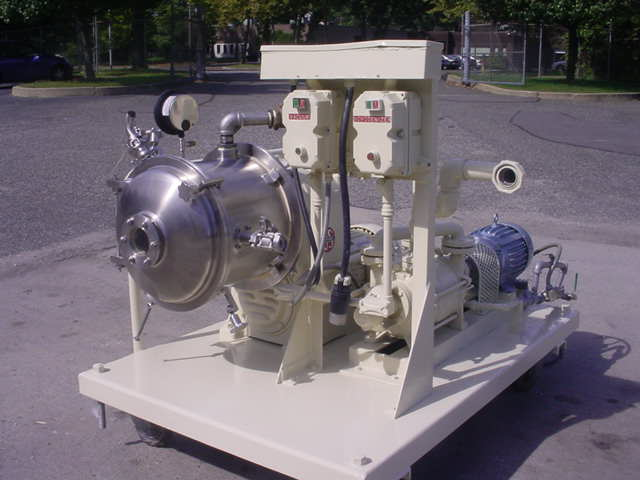 1-USED CORNELL MACHINE COMPANY MODEL D16 STAINLESS STEEL SANITARY VERSATOR, S/N 6353-R. DRIVEN BY 15 HP 3/60/230-460 VOLT, EXPLOSION PROOF MOTOR, THIS VERSATOR IS MOUNTED ON PORTABLE BASE WITH CASTERS. ALSO EQUIPPED WITH SIHI 7.5 HP EXPLOSION PROOF VACUUM PUMP, 3/60/230-460 VOLT. CORNELL VERSATOR CAN FUNCTION AS A DEAERATOR, EMULSIFIER, HOMOGENIZER, DEGASSER, AND DEFOAMER.